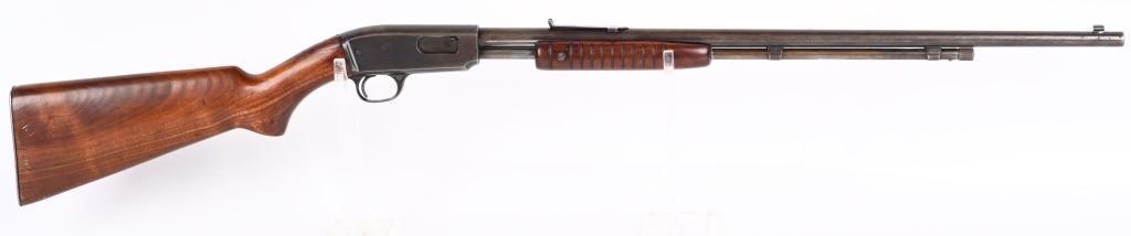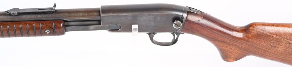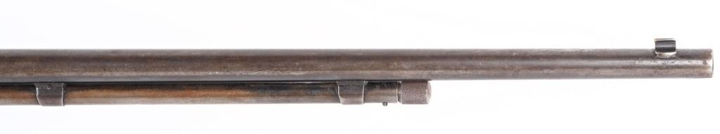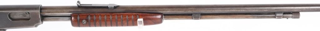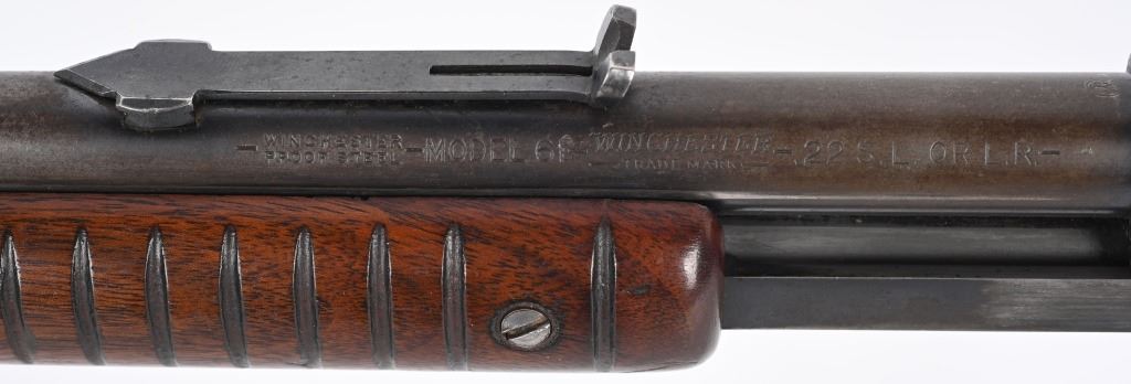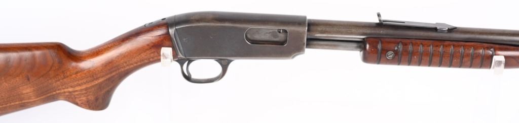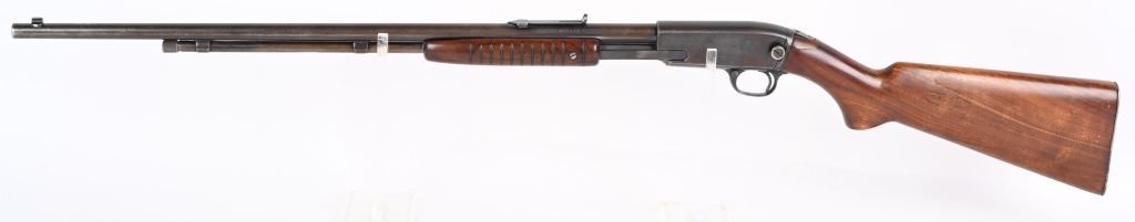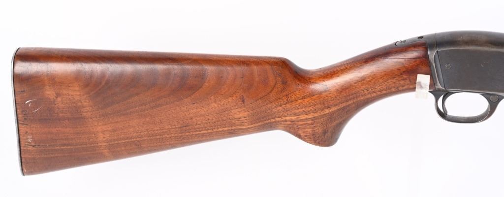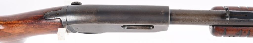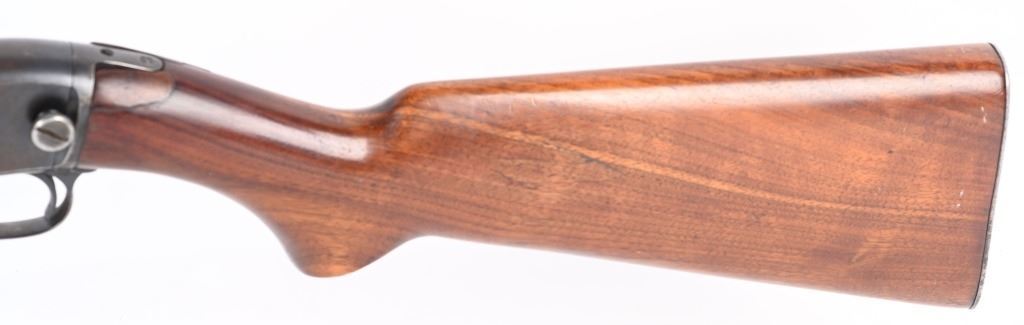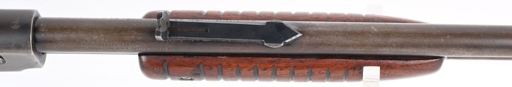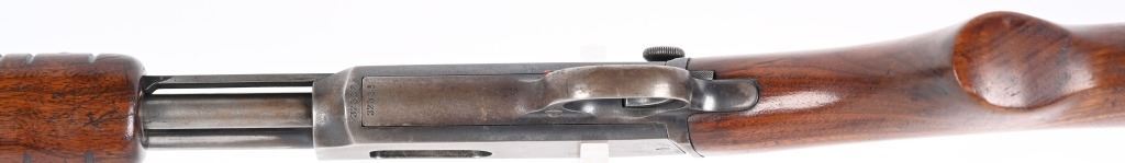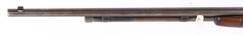 SERIAL NUMBER: 32338. BARREL: 24". CALIBER: .22 S L LR. MANUFACTURED: 1937. Standard takedown model, with typical markings on the barrel. matching serials on both half's. Blade front sight, with v-notch leaf rear. Rear elevation slider is absent. Original blued finish. Re-finished oiled wood stock/forearm. Checkered metal butt plate. CONDITION: Metal is good overall, with general wear and brown patina forming throughout. There is a repaired crack on the left side of the tang, and one on the right as well. Wood has a few minor handling marks and scratches. Bore is clean overall, with crisp rifling. Mechanically fine. C&R