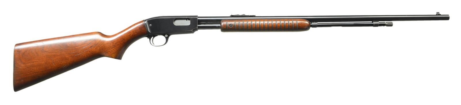Cal. 22 S,L,LR. S#. 226602. Bbl. 24" with original sporting sights. Grooved receiver. Flat bottom grooved forend and pistol grip walnut stock with checkered steel buttplate.1957 mfg. CONDITION: Over 85% lightly worn blue shows edge & carry wear. Lightly worn wood finish shows scattered scratches & marks. Very good bright bore. (22-5378/DS). CURIO. $800-1100.