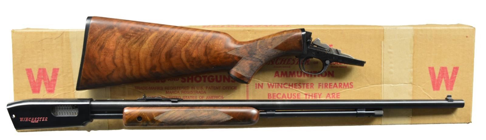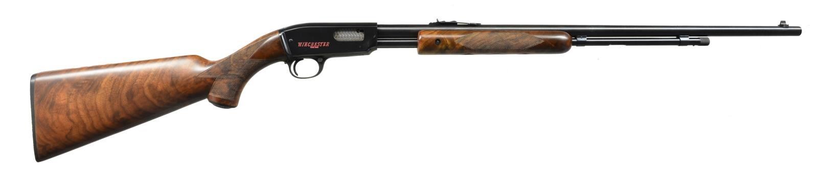 BOX. Cal. 22 S, L, LR. S# 322521. Bbl. 24". Dovetail bead front sight. Adj. dovetail rear sight. Right side of receiver has added “WINCHESTER” in red script. Custom aftermarket wood of fancy walnut. Checkered forearm & pistol grip stock w/ Winchester hard rubber grip cap & Winchester hard rubber buttplate. Forearm is checkered w/ panels on each side & bottom w/ 3-diamond pattern w/ top & bottom diamond checkered. UNATTACHED ACCESSORIES: original style box w/ repro end label & hang tag are stamped “SPECIAL DELUXE”. CONDITION: 99% reblued finish. Stocks have very good finish. Near excellent bore. (20-1695/BT). CURIO. $3,000-5,000.
