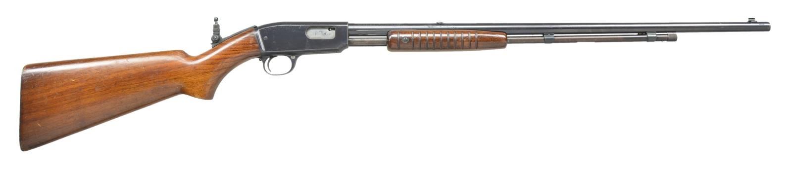 Cal. 22 S,L,LR. S# 35364. Bbl. 24" rd. Bead front sight, filler in rear dovetail w/ Marbles tang sight. Short grooved forearm & pistol grip walnut stock W/ checkered steel butt plate. Mfg. 1938. CONDITION. Bbl & action retain over 90% blue showing spots of freckling. Mag. tube has faded blue. Original wood finish shows light wear w/ numerous scratches & marks. Bright near excellent bore. (21-4097/DS). CURIO. $800-1,100.