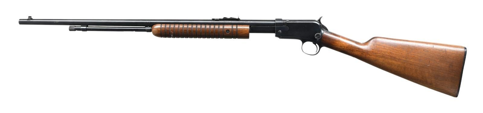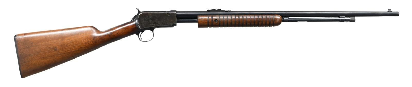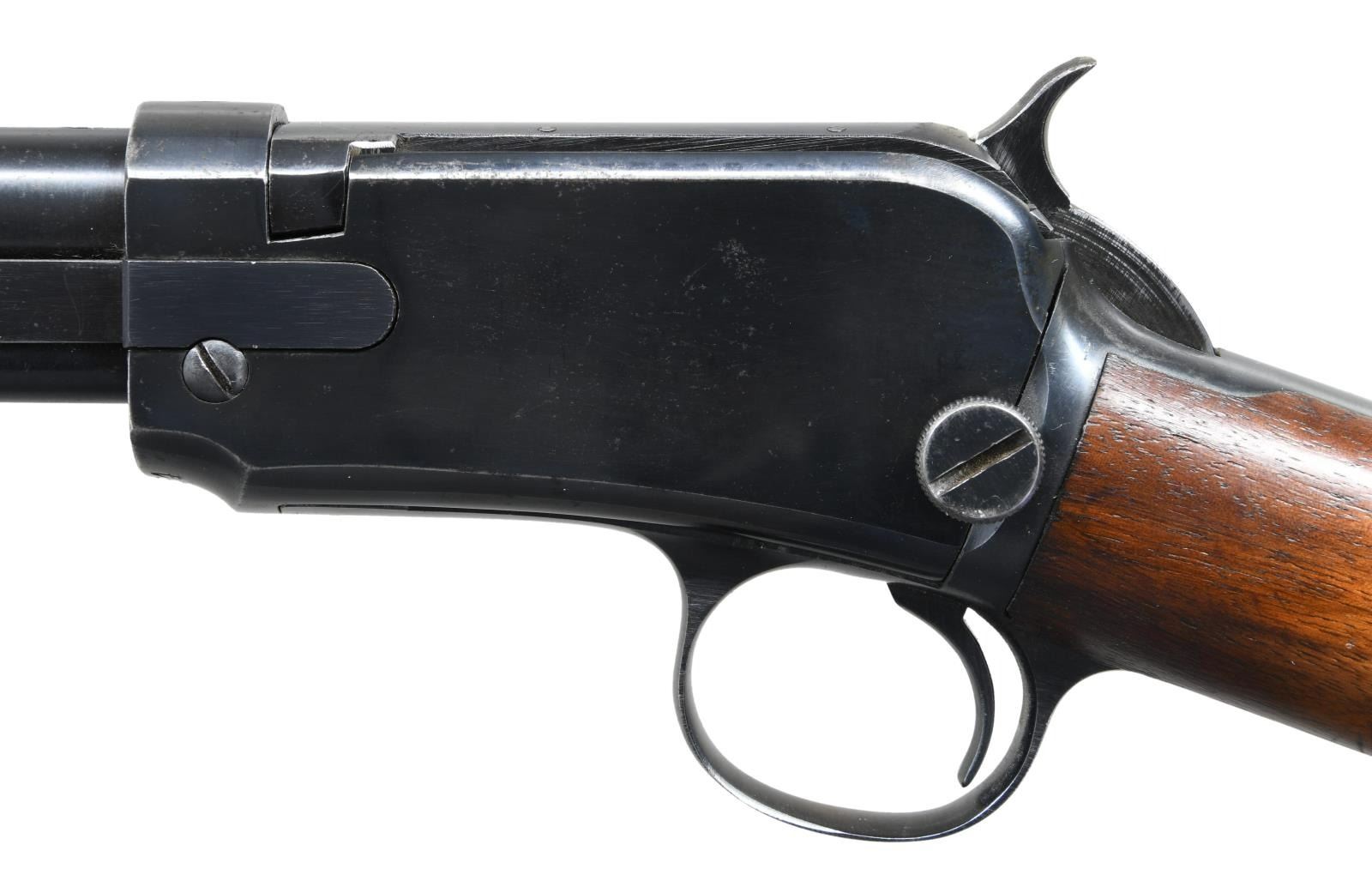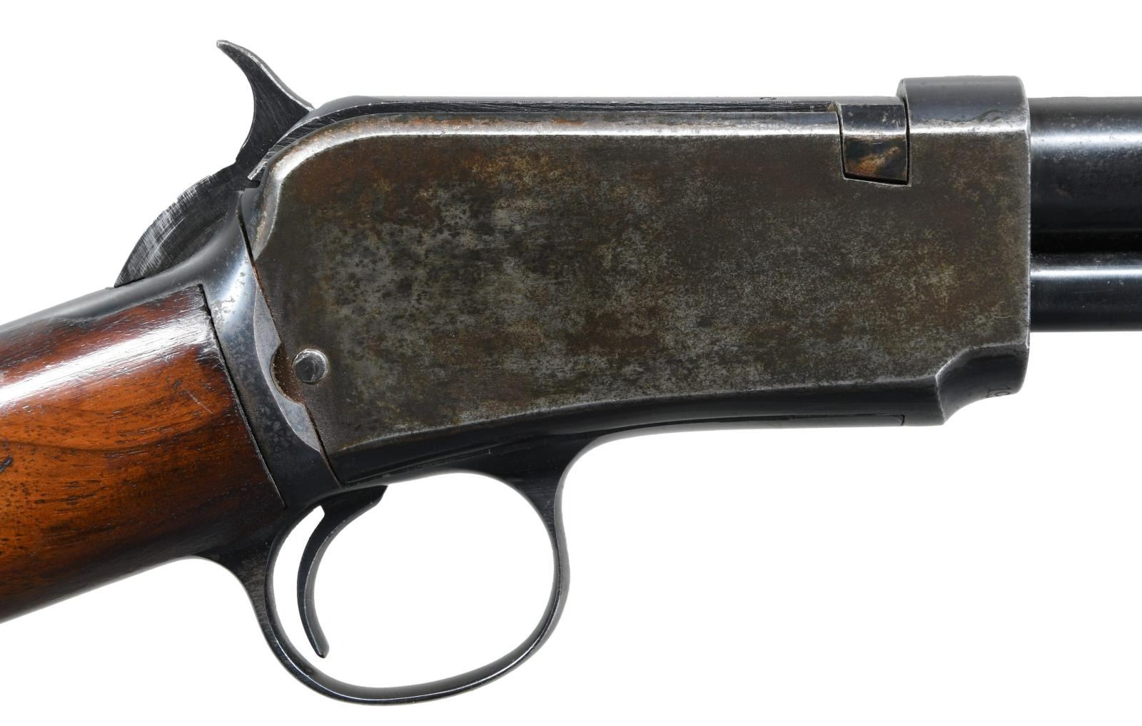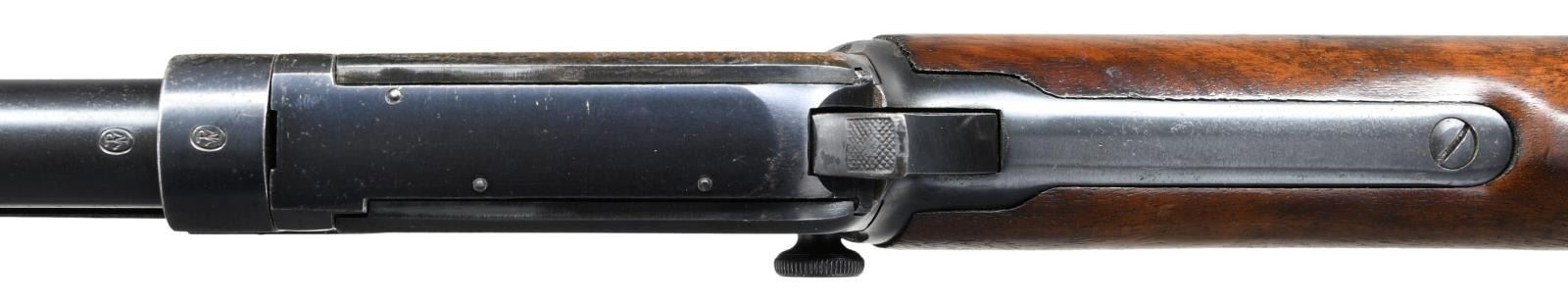 Cal. 22 S, L or LR. S# 197854. Bbl. 23". Mfg. 1946 w/ fixed front & adjustable rear sights. Matching S# on frame & Bbl. assembly. Takedown action & 17 grooved forend w/ smooth straight grip buttstock & Winchester checkered buttplate. CONDITION: metal retains about 90% original blue w/ freckling, light spots of rust, scratches & light dings. Stock set shows dings & light dents w/ heavier marks to include scrapes & gouges on the forend. Bore is very good, bright & strongly rifled. (23-1610/CW). CURIO. $450-600.
