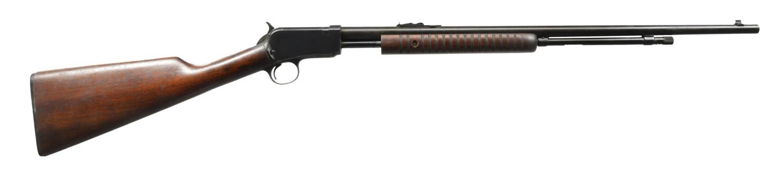 Cal. 22 S, L, LR. S# 325334. Bbl. 23" rnd. Bead front sight w/ elevator adj. sporting rear sight. Tubular mag. Blue finish. Flat bottom grooved forearm & straight grip walnut stock w/ original buttplate. 1954 Mfg. CONDITION: 90% lightly faded blue showing some light surface corrosion. Original wood finish shows moderate wear w/ scattered scratches, marks & mildew spots. Bore retains strong rifling. (20-2615/DS). CURIO. $400-600.