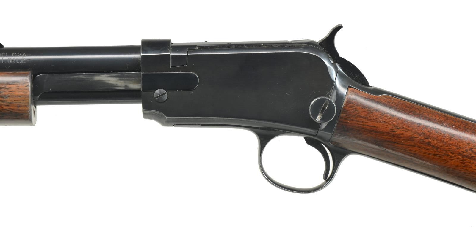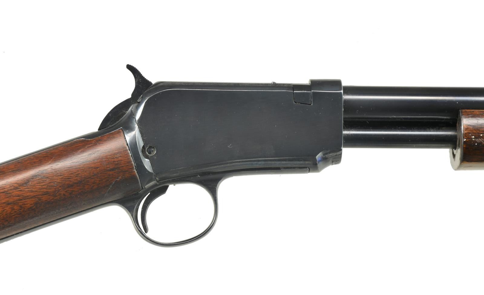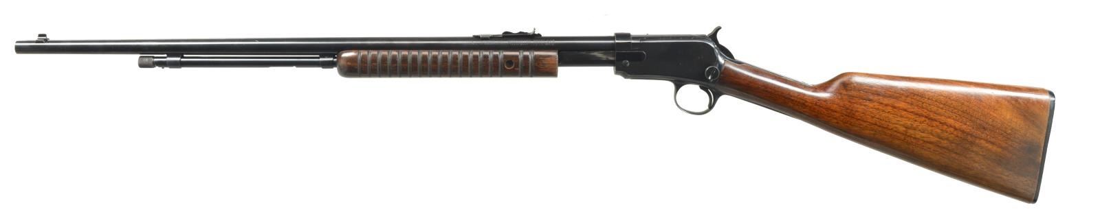 Cal. 22 S, L, LR. S# 199551. Bbl. 23" w/ dovetail bead front sight & dovetail adjustable rear sight. 17 Ring flat bottom forend. Uncheckered straight grip stock w/ Winchester hard rubber buttplate. CONDITION: metal retains 97% reblued finish showing some slide wear. Refinished stock is undersized around action tangs. Forend has original finish w/ some minor handling marks. Buttstock has original finish w/ some minor marks & hand worn patina in grip area. Bright bore. (20-1712/BT). CURIO. $1,200-1,800.