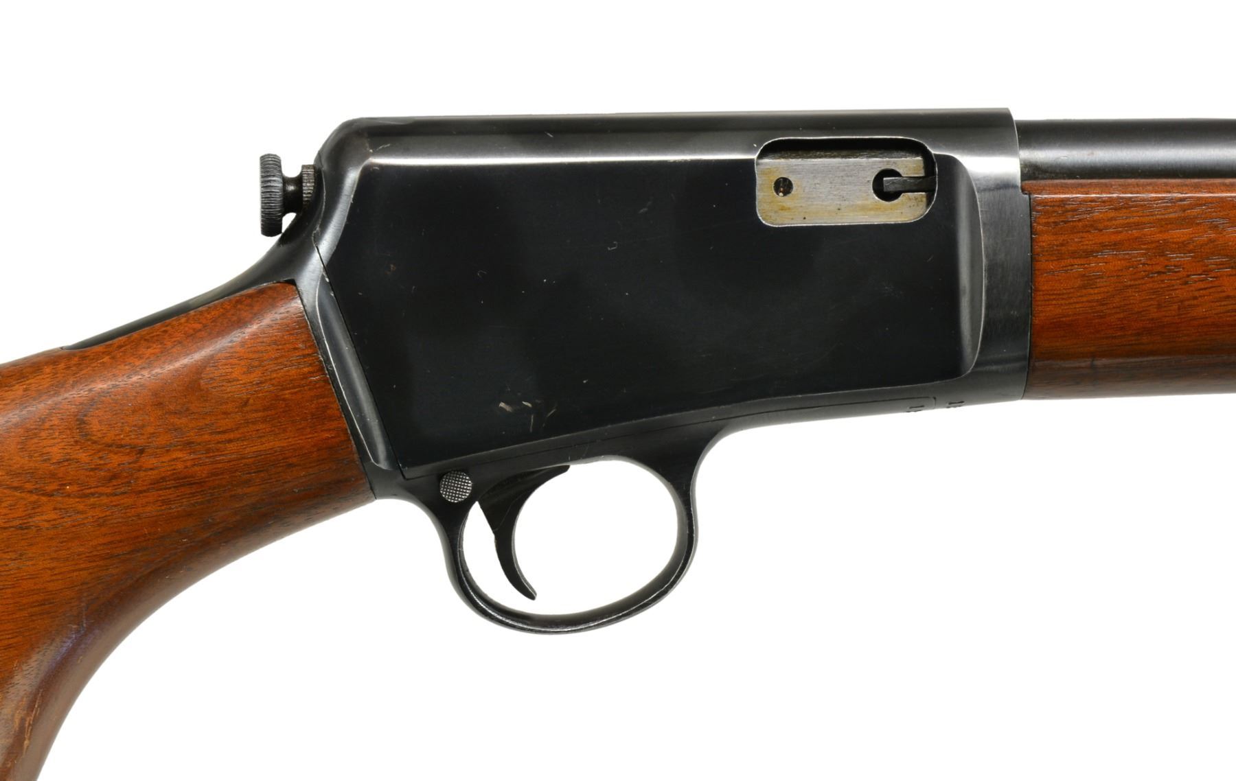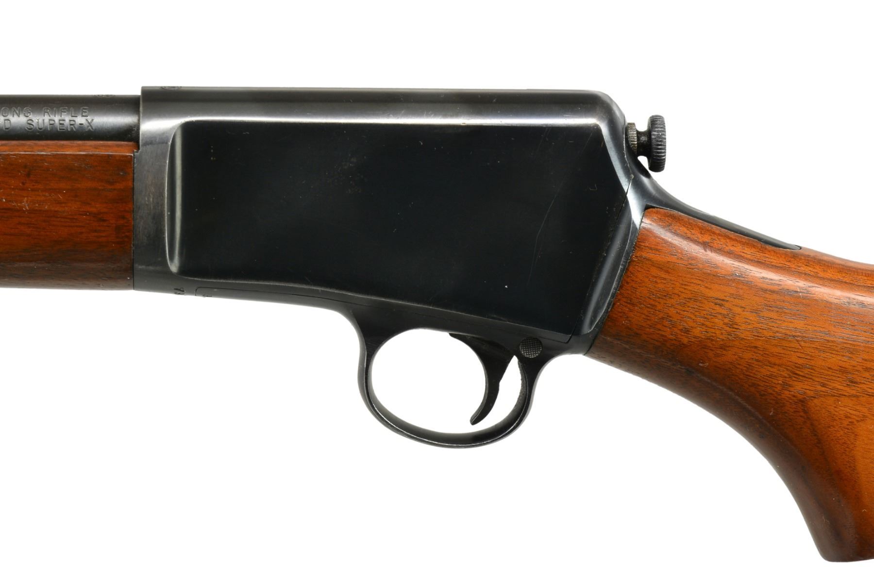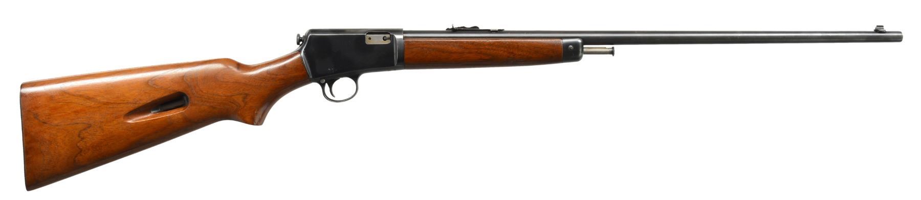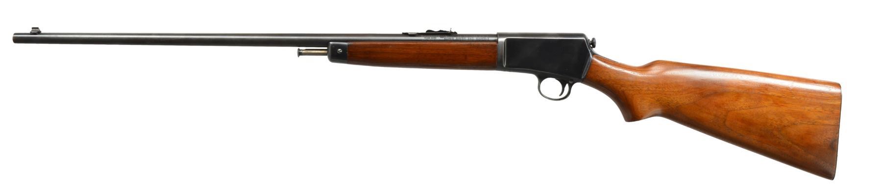 Cal. 22 LR for Super Speed or Super X ammo. S# 112826A. Bbl. 23" rnd. w/ sporting sights. Smooth top receiver. Walnut forearm & pistol grip stock w/ tubular mag. that loads through steel buttplate. 1936 Mfg. CONDITION: bbl. & action retain over 90% lightly faded blue showing mild edge wear & scattered light scratches. Refinished wood shows scattered sm. scratches & marks. Bore is bright w/ strong rifling. (20-741/DS). CURIO. $500-700.