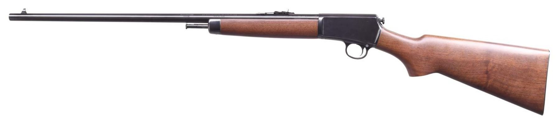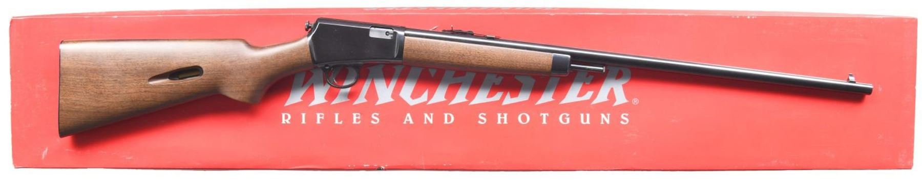Cal. 22 LR. S# ST1318. Bbl. 22". Bead front sight. Sporting rear sight. The receiver is grooved for sight mounting. Newer production Winchester Model 63 is made in Japan. Blued finish. Walnut stock and forend. UNATTACHED ACCESSORIES: one matching-numbered factory box, another matching-numbered "A-Bolt Small" box, manual, and paperwork. CONDITION: stock set shows a few light handling marks. Metal retains 98% original blue with some light handling and operational wear. Very good, bright bore. PROVENANCE: the lifelong collection of Terrance McCarty. (24-391/MJC). MODERN. $300-400.