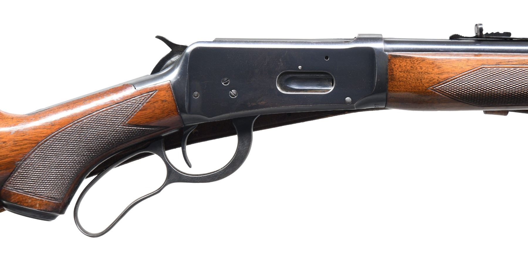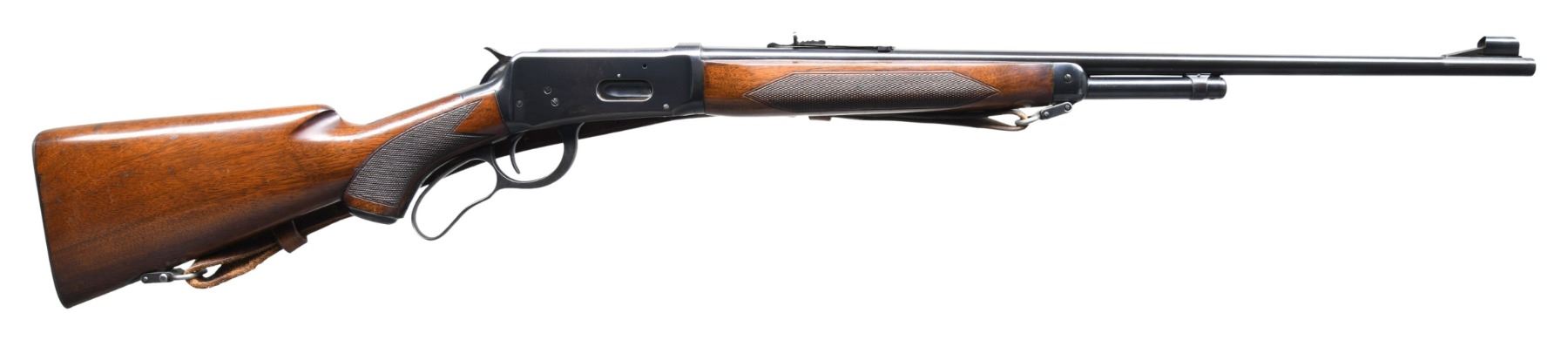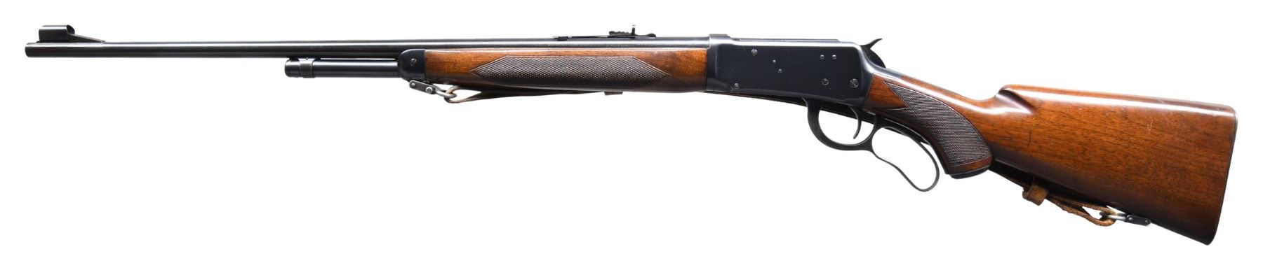 Cal. 30 WCF (30-30). S# 1985132. Bbl. 24" tapered rnd. Hooded ramp bead front sight with sporting rear sight. 2/3 length tubular mag. Blue finish. Walnut forearm and steel capped pistol grip stock with factory checkering and checkered steel buttplate. Boyt military style sling on Super Grade swivels. Mfg. in 1953. CONDITION: over 95% original blue showing light edge wear. Original wood finish shows scattered scratches and marks. Very good bright bore. (25-1732/DS). CURIO. $2,000-2,750.