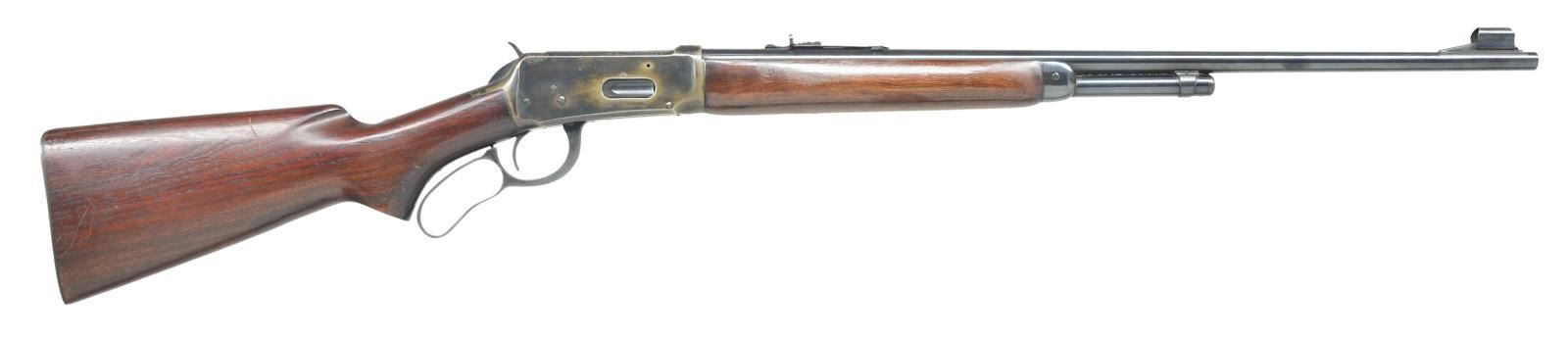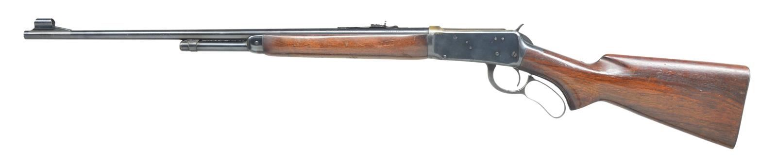 Cal. 32 WS. S# 2183863 (1956). Bbl. 24" w/ hooded ramp bead front sight & elevator rear sight. Half length tubular mag. Walnut forearm & pistol grip stock w/ checkered steel buttplate. CONDITION: very good bbl. blue. Good receiver blue blending w/ spots of cold blue refinish & peppery oxidation throughout. Good worn wood finish w/ lg. cracks, moderate handling marks & gouges at forearm & wrist. Very good bore. (22-2820/MD). CURIO. $500-800.