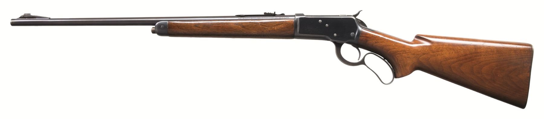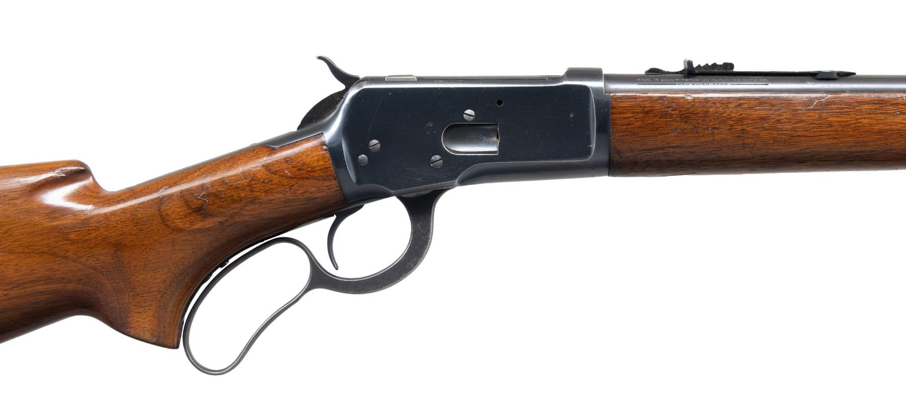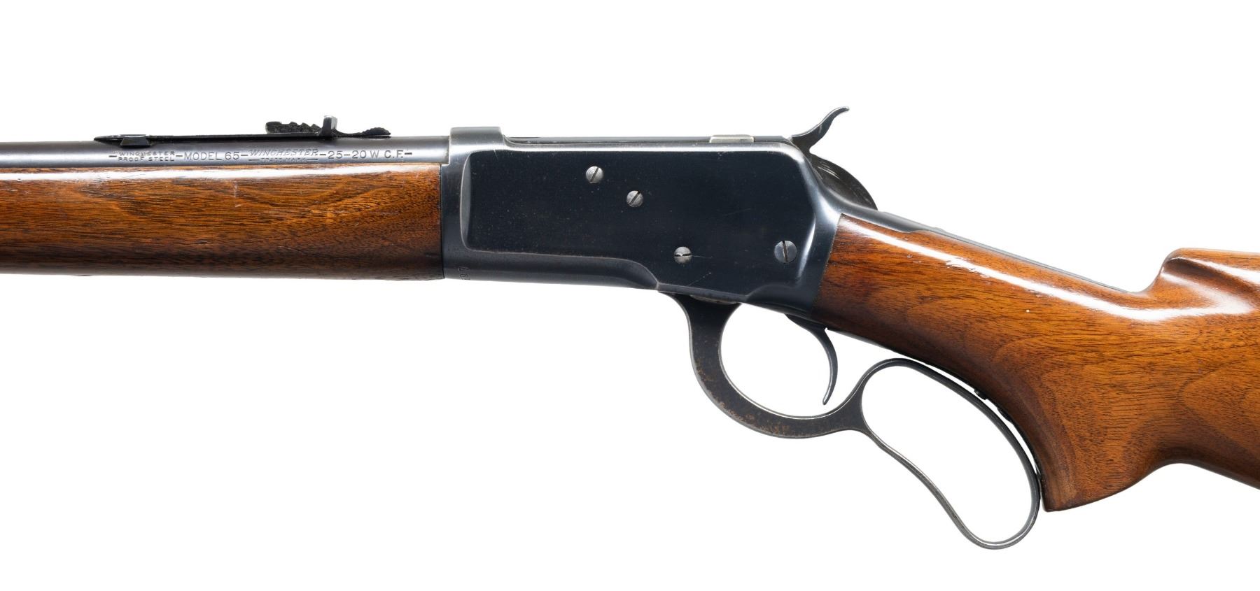 Cal. 25-20. S# 1006697. Bbl. 22". Model 65 lever action rifle mfg. by Winchester. Standard markings on bbl. denoting the model and cal. designations. Metal components exhibit a blue finish overall. Plain wood straight grip stock and forend, with flat checkered steel buttplate. Ramped aluminum beaded blade front sight with U-notch rear sight. Button mag. CONDITION: metal components retain large amounts of their original factory blue finish, showing some areas of wear and thinning, scattered spots of light surface oxidation, as well as flaking on the underside of the receiver and on the lever. Mirror bore, exhibiting well defined rifling throughout. Proper manual mechanics. Wood furniture shows scattered marks and impressions from handling and storage, with a small chip present on the forward edge of the pistol grip. PROVENANCE: The Esteemed Norm Greenberg Collection. (25-4202/MLW). CURIO. $800-1,200.