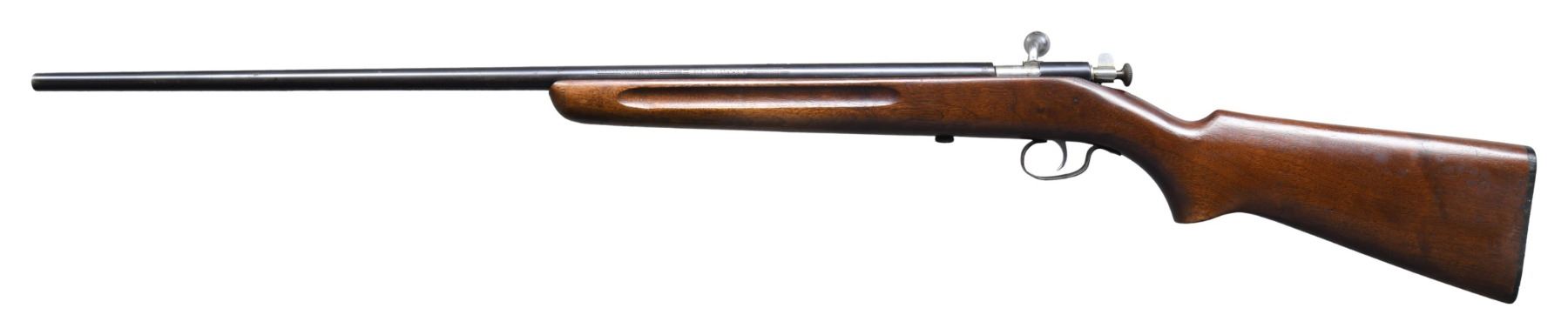 Cal. 22 S, L, LR. NSN. Bbl. 27 1/8". Model 67 single shot bolt action rifle mfg. by Winchester between 1934-1963. Left side of the bbl. is marked with Winchester's mfg. information, followed by the model and cal. designations, as well as the Winchester trademark logo. Metal components exhibit a blue finish overall, save for on the bolt assembly (minus the cocking piece), which exhibits a nickel plated finish. Plain wood pistol grip buttstock, with grasping grooves and Winchester checkered black synthetic buttplate. Bbl. exhibits no provision for a front or rear iron sight, and is drilled and tapped. CONDITION: metal components retain the majority of their original factory blue finish, exhibiting some spots of wear and thinning, with scattered spots of light surface oxidation present overall. Underside of bbl. exhibits scattered spots of light to mild pitting and dark surface oxidation. Bolt is good, showing some flaking overall. Mirror bore, exhibiting well defined rifling throughout. Stock shows some superficial marks and minor impressions from handling and storage, but otherwise remains sturdy and serviceable. PROVENANCE: Estate of Russell Dickerman. (25-1775/MLW). CURIO. $200-400.