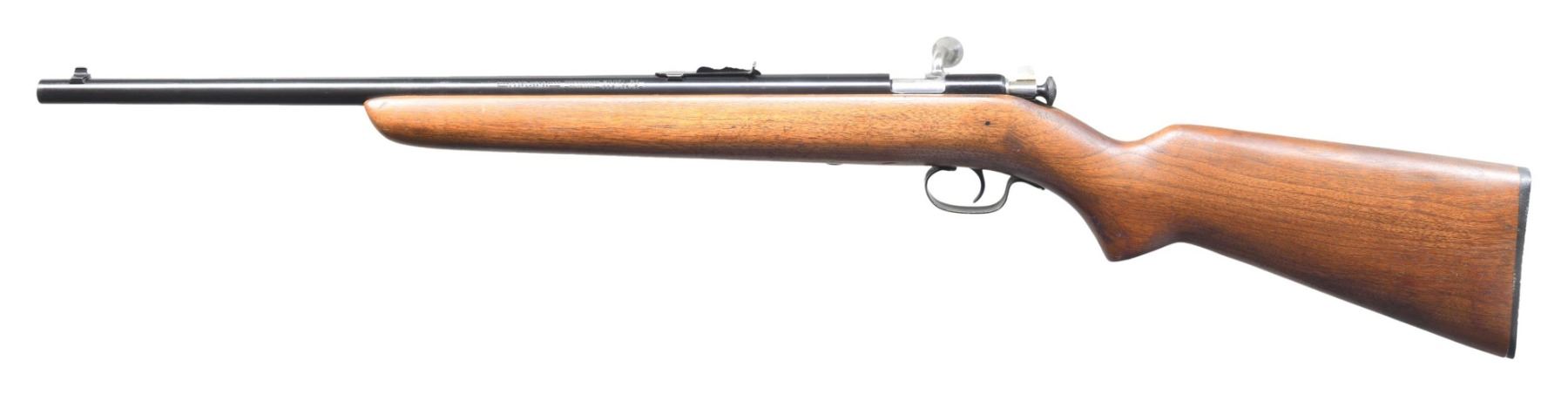 Cal. 22 S, L, LR. NSN. Bbl. 20" rnd., with integral single shot action. Chrome plated bolt, with manual cocking piece and wing type safety. Bead front sight, with elevator adj. sporting rear sight. Youth length walnut stock has original buttplate. Mfg. from 1934-1963. CONDITION: 99% original blue. Bbl. has an irregular turning mark 3 1/2" from the muzzle. Stock has good original finish, showing scattered scratches and marks. Bright near excellent bore. (25-3029/DS). CURIO. $200-300.