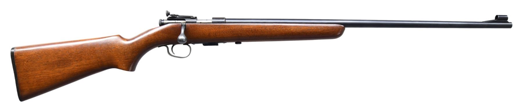 Cal. 22 S, L, LR. NSN. Bbl. 25". Model 69 bolt action rifle mfg. by Winchester between 1935-1963. The left side of the bbl. is marked with Winchester's mfg. information, followed by the model and cal. designations, as well as the Winchester trademark logo. Metal components exhibit a blue finish overall, save for on the bolt body, which is polished in-the-white. 1-piece plain wood pistol grip buttstock, with Winchester checkered black synthetic buttplate. Aluminum beaded, ramped, and hooded blade front sight, with adj. aperture rear sight. MAGS: 1 5-rd. CONDITION: metal components retain the majority of their original factory blue finish, exhibiting scattered spots of light wear and thinning, with some scattered superficial handling marks and spots of light surface oxidation present overall. Bolt knob shows areas of wear and thinning that show through to gray patina. Mirror bore, retaining well defined rifling throughout. Stocks shows some scattered superficial marks and minor impressions from handling and storage, but otherwise remains very good overall. PROVENANCE: Estate of Russell Dickerman. (25-1832/MLW). CURIO. $300-400.