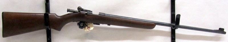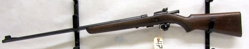NON-RESTRICTED, BOLT-ACTION, .22LR, 25" BARREL, NO SN. STOCK HAS NUMEROUS SCRACHES AND A REPAIR ON RIGHT SIDE OF RECEIVER. BLUEING HAS LIGHT PITTING ALONG MOST OF THE FIREARM. BORE IS MOSTLY SHINY, BUT HAS A FEW PIT MARKS.
