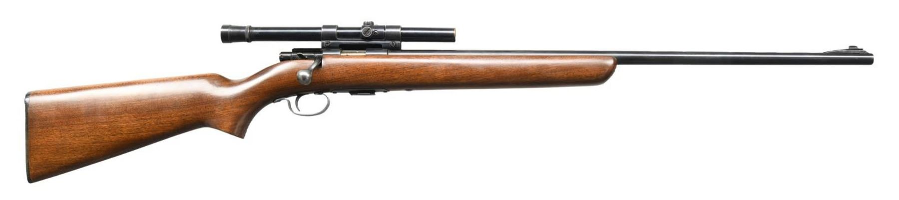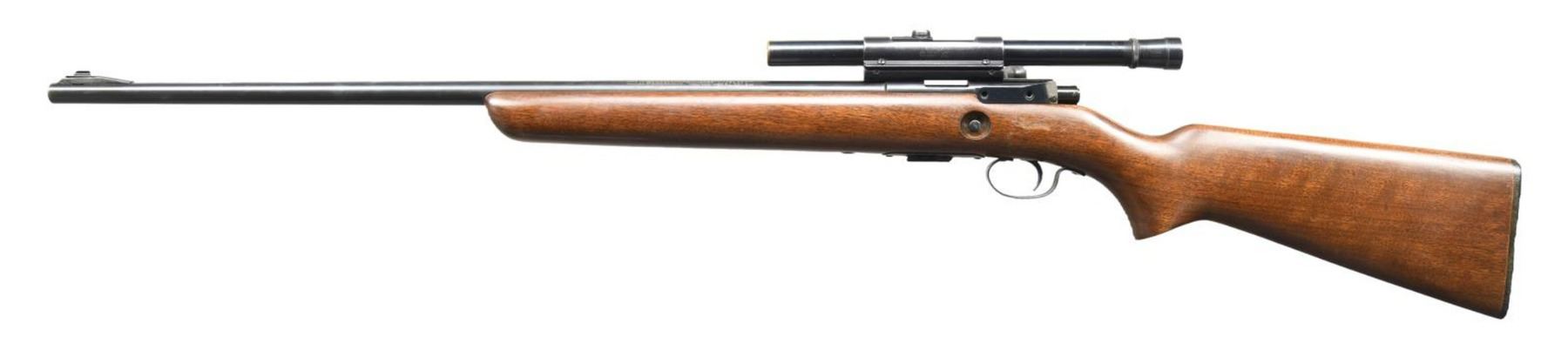 Cal. 22 S, L, LR. NSN. Bbl. 25 1/8". Model 69A bolt action rifle mfg. by Winchester. Left side of bbl. is marked with Winchester's mfg. information, followed by the Winchester trademark logo, as well as the model and cal. designations. Metal components exhibit a blued finish overall. Plain wood pistol grip buttstock. Ramped blade front sight. Receiver is mounted with a Weaver scope mount fitted with a Weaver B4 scope. Rear sight is no longer present. MAGS: 4 5-rd. CONDITION: metal components retain the majority of their original factory blue finish, exhibiting some scattered spots of mild wear and thinning that show through to brown patina. Mirror bore, exhibiting well defined rifling throughout. Stock shows some light marks from storage and handling, but is otherwise good overall. Scope retains a clear optic. (23-6015/MLW). CURIO. $300-400.