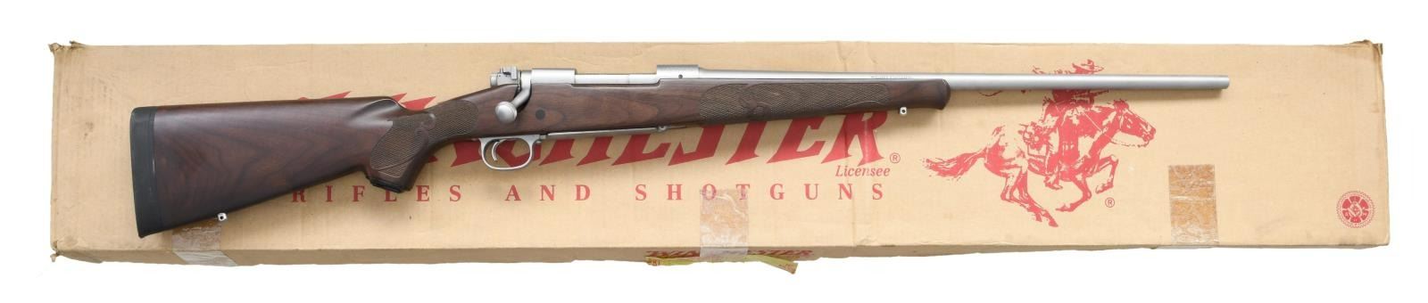 Cal. 270 Win. S# G3016029. Bbl. 22". This Classic Featherweight Stainless steel rifle has no sights, nor provisions for them; but top of receiver has 4 drilled & tapped holes w/ plug screws. Hinged floorplate & 3 position safety on jeweled bolt. Fleur de Lis checkered one piece stock w/ semi Schnabel tip, sling swivel studs, ebony capped pistol grip & recoil pad. UNATTACHED ACCESSORIES: factory cardboard box labeled to the rifle by Model & serial number; but the label states a 24" Bbl. Box contains the bolt & paperwork; foam is disintegrated. CONDITION: metal shows little signs of use but poor storage w/ spots of discoloration & freckling. Stock is near excellent w/ strong nearly crisp checkering. Bore is very good, bright & strongly rifled. (23-1176/CW). MODERN. $700-1,000.