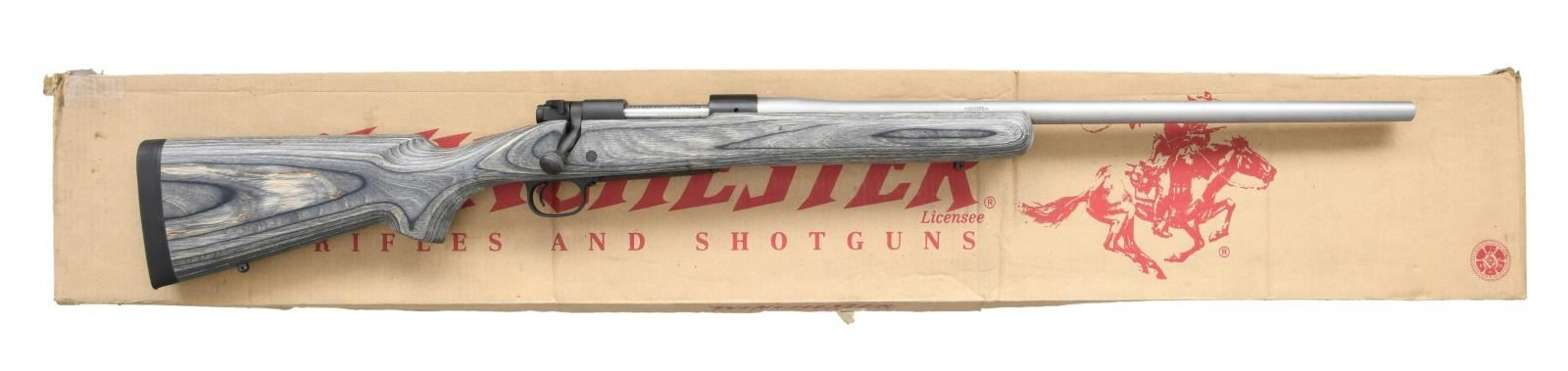 Cal. 300 WSM. S# G3040720. Bbl. 24". Coyote Stainless Laminated medium/heavy stainless Bbl., uncheckered gray laminate stock w/ reverse taper on forend & 3 shot internal magazine w/ hinged floorplate. Sling swivel studs. No sights nor provisions for them. Top of receiver has 4 drilled & tapped holes filled w/ plug screws. UNATTACHED ACCESSORIES: Factory box labeled to the rifle w/ lock & bolt. CONDITION: metal shows light use, but poor storage w/ spots of discoloration, freckling & light scattered rust & dirt. Stock has some scuffs & light mildew. Bore is very good, bright & strongly rifled. (23-1175/CW). MODERN. $500-800.