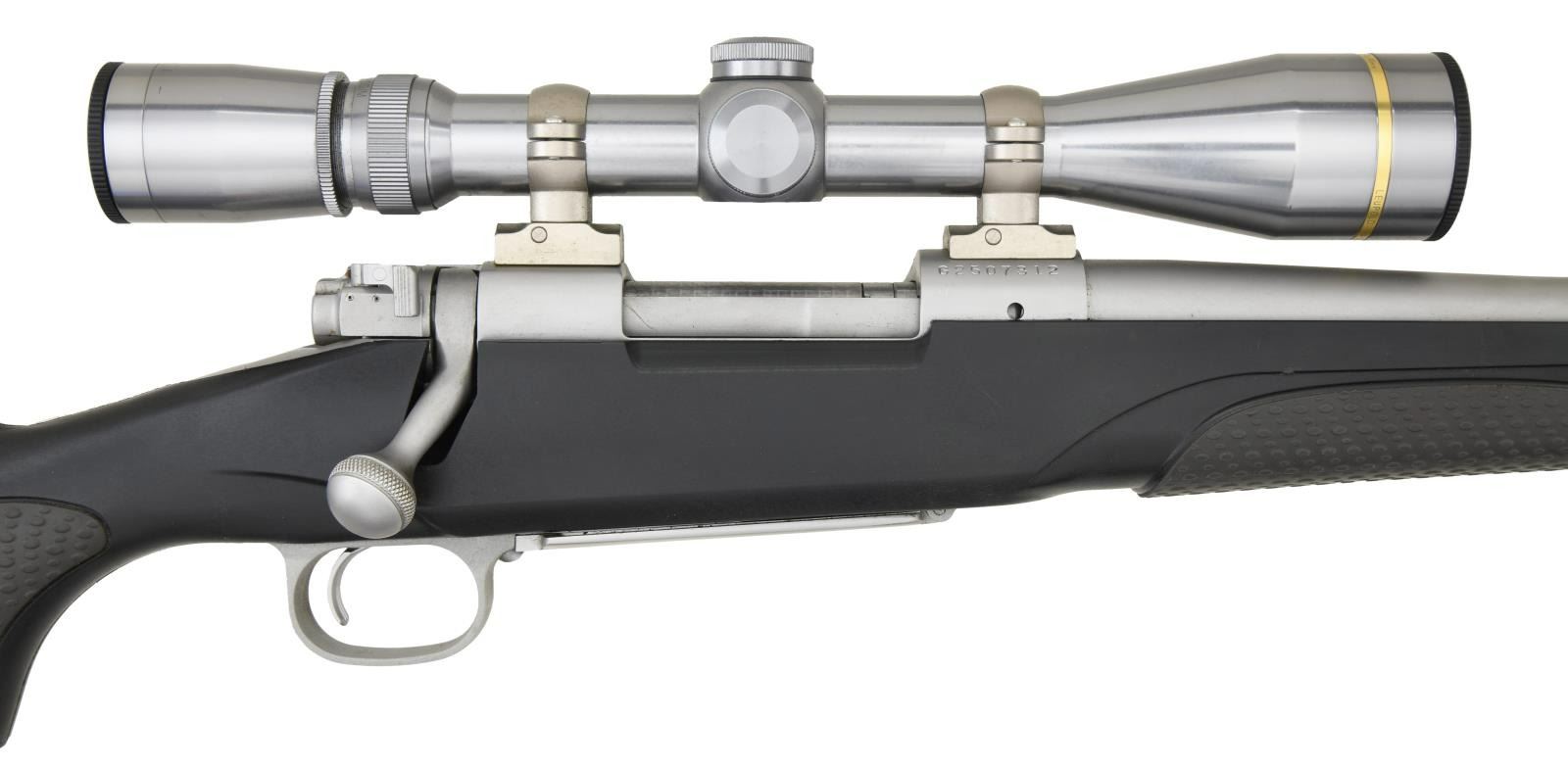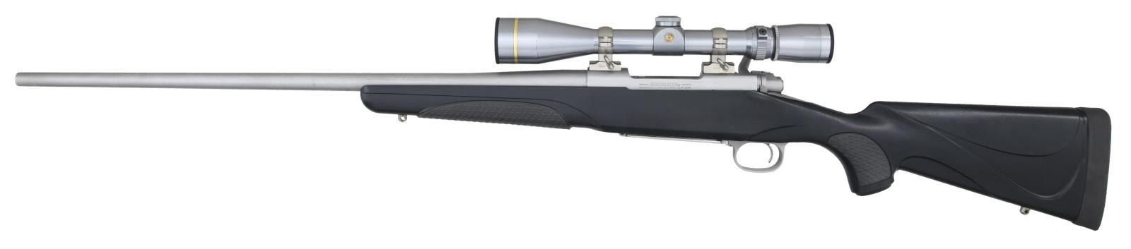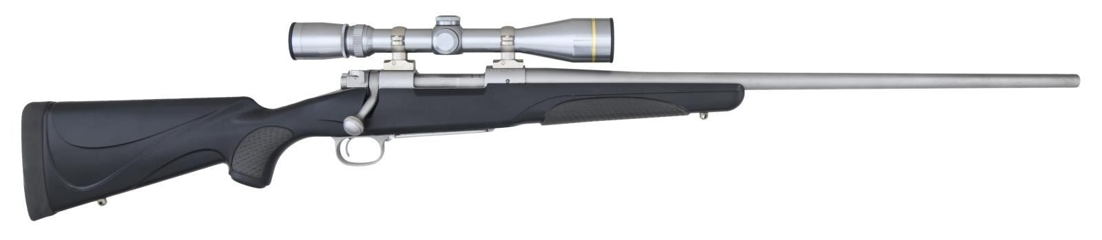 STAINLESS BOLT ACTION RIFLE. Cal. 300 WSM. S# G2507312. Bbl. 24" w/out sights. Leupold VX-III 3.5-10x40mm scope w/ rangefinding reticle on Leupold satin stainless dual dovetail rings & bases. Satin stainless finish. Black synthetic stock w/ oversized rubber oval dot gripping surfaces on forearm & grip, & WinSorb recoil pad. UNATTACHED ACCESSORIES: scope lens. CONDITION: near excellent stainless finish w/ areas of staining. Very good stock w/ couple of gouges. Near excellent bore w/ some dark spots. Scope has near excellent finish & clear, serviceable optics. (23-1138/MD). MODERN. $500-800.