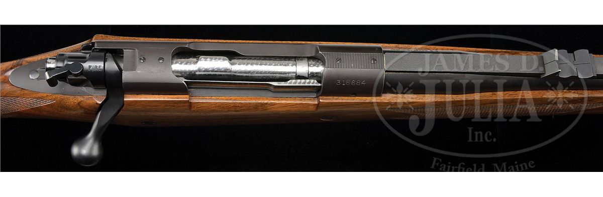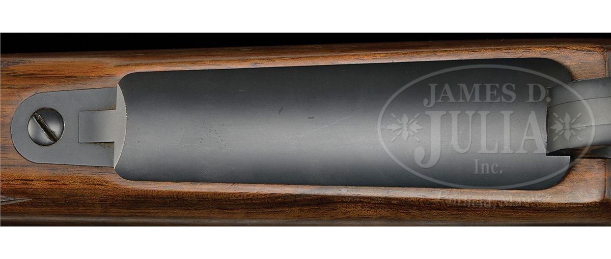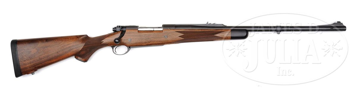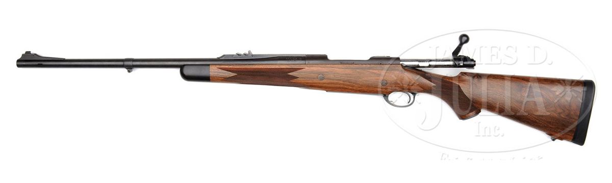 SN 318684. Cal. .416 Rem. Mag. 22-3/4" Medium weight bbl is stamped "G R Douglas" over caliber and "XX" on left rear. Bbl is fitted with matted quarter rib mounting one standing, two folding leaf express sight, banded-on sling eye, and matted front ramp with longitudinally dovetailed silver bead front sight. Muzzle has been ported. Magnum Model 70 action is essentially unaltered, bolt body jeweled. Action is fitted with Blackburn type drop box bottom metal with hinged floorplate and release in trigger guard bow. Nicely mottled, somewhat burl figured European walnut classically styled stock measures 13-1/2" over black Decelerator pad and features steel grip cap, ebony forend tip, two reinforcing bolts, sling eye in John Bolliger type raised island pad, and well cut point pattern checkering in classic English style. Drop at heel: approx 2-1/4", drop at comb: approx 1-5/8". Weight: 8 lbs. 2 oz. LOP: 13-1/2". CONDITION: Excellent, with minor marks and some silvering on metal. Wood has a considerable number of marks and spotting in its orig finish. Checkering is slightly darkened. Bore is excellent. Action is smooth. 4-49361 MGM239