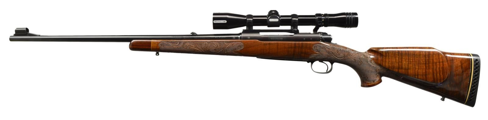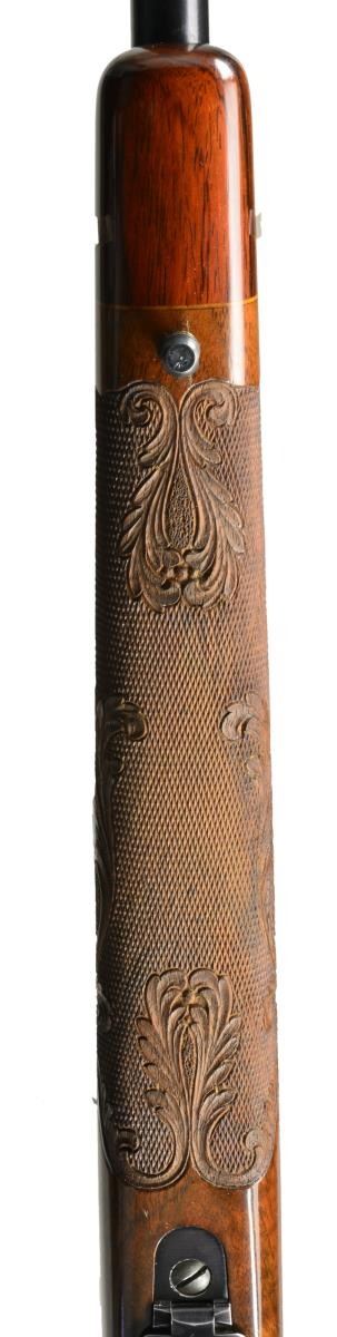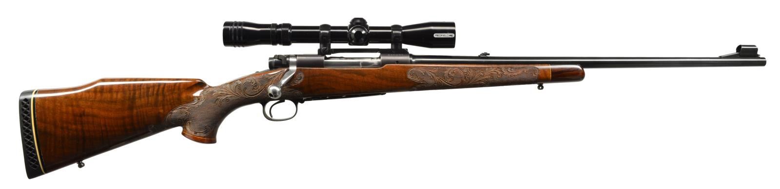 ACTION SPORTING RIFLE. Cal. 264 Win. Mag. S# 550251. Pre 64 Model 70 Featherweight rifle. Custom Monte Carlo cheekpiece stock of fancy fiddle grain walnut by Reinhart Fajen Co. of Warsaw, Missouri. Forearm & wrist of stock feature hand checkering featuring exquisite style A vine type foliate hand carving by Fajen's Master Carver. Stock features include rosewood forearm tip & grip cap w/ contrasting spacers & sculpted swivel bases. LOP: 13 1/2" over White Line pad. Bbl. 22" Light sporter weight w/ hooded ramp mounted bead front sight & folding leaf rear sight. Redfield Lo-Pro 3-9x gloss finished scope w/ duplex reticle on Redfield Sr. mt. Bolt body, handle & extractor are polished bright. CONDITION: bbl. & action retain over 95% blue. Alloy floorplate shows light fading. Stock has very good custom finish. Sound mechanics. Good bright bore. (20-1920/DS). MODERN. $2,500-4,000.