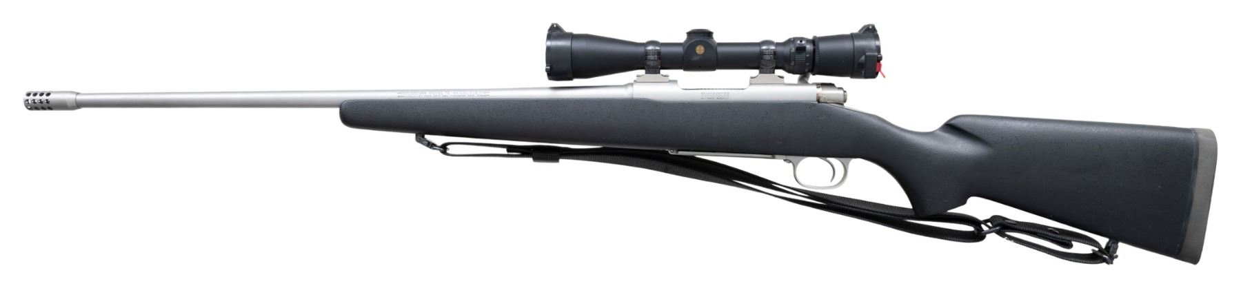 RIFLE. Cal. 308. S# G59862. Bbl. 22". Model 70 SA Classic Stainless bolt action rifle mfg. by Winchester. Left side of the bbl. exhibits standard markings denoting Winchester's mfg. information, as well as the model and cal. designations, with "-CLASSIC STAINLESS-" marked on the right. Metal components exhibit a stainless steel finish overall, save for on the bolt, which is jeweled in-the-white. 1-piece textured black composite buttstock with Pachmayr Decelerator black rubber recoil pad. Receiver is factory drilled and tapped, currently fitted with a Leupold 2.5-8x scope. Threaded bbl. is fitted with a stainless steel radial muzzle brake. Unmarked black nylon sling. CONDITION: metal components are very good, showing some superficial handling marks overall. Hinged floorplate exhibits several scratches and a light layer of surface oxidation. Brilliant mirror bore, retaining well defined rifling throughout. Proper manual mechanics. Scope retains a clear and sharp optic. (25-3810/MLW). MODERN. $500-700.