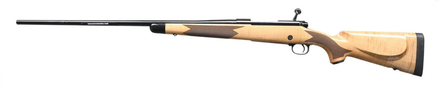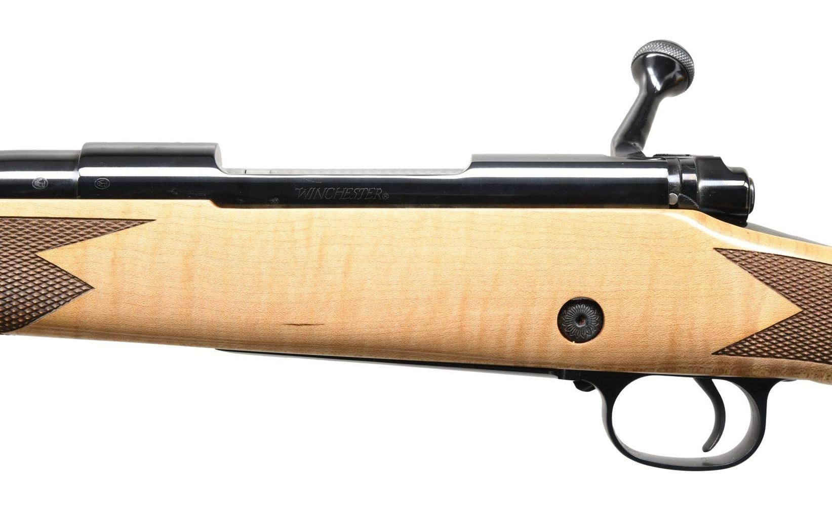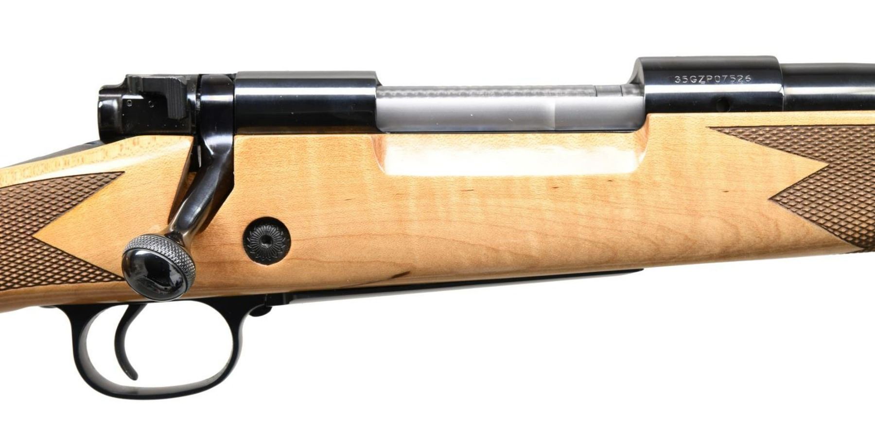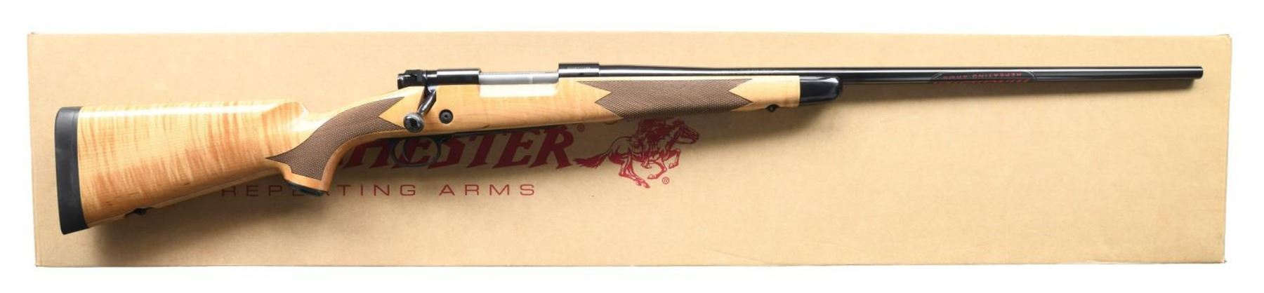 WITH MATCHING FACTORY BOX. Cal. 264 Win Mag. S# 35GZP07526. Bbl. 26". Model 70 Super Grade bolt action rifle mfg. by Browning Viana in Portugal and imported by BACO Inc. The left side of the bbl. is marked with the Winchester trademark logo, followed by the model and cal. designations, with the right side being marked "- MODEL 70 SUPER GRADE -" above BACO's importer and Browning Viana's mfg. information. Floorplate is marked "-SUPER GRADE-". Metal components exhibit a lustrous blued finish overall. Checkered wood maple buttstock with black rubber Decelerator recoil pad and blued steel pommel cap. Receiver is factory drilled and tapped. UNATTACHED ACCESSORIES: matching factory box. CONDITION: near new, with metal components retaining virtually all of their original factory blue finish overall. Mirror bore, exhibiting well defined rifling throughout. Maple stock is excellent overall. Box shows some mild exterior wear, but otherwise remains sturdy and serviceable. PROVENANCE: The Collection of Gun Sport Ltd owned by Jon R. Thomas. (23-3697/MLW). MODERN. $800-1,200.