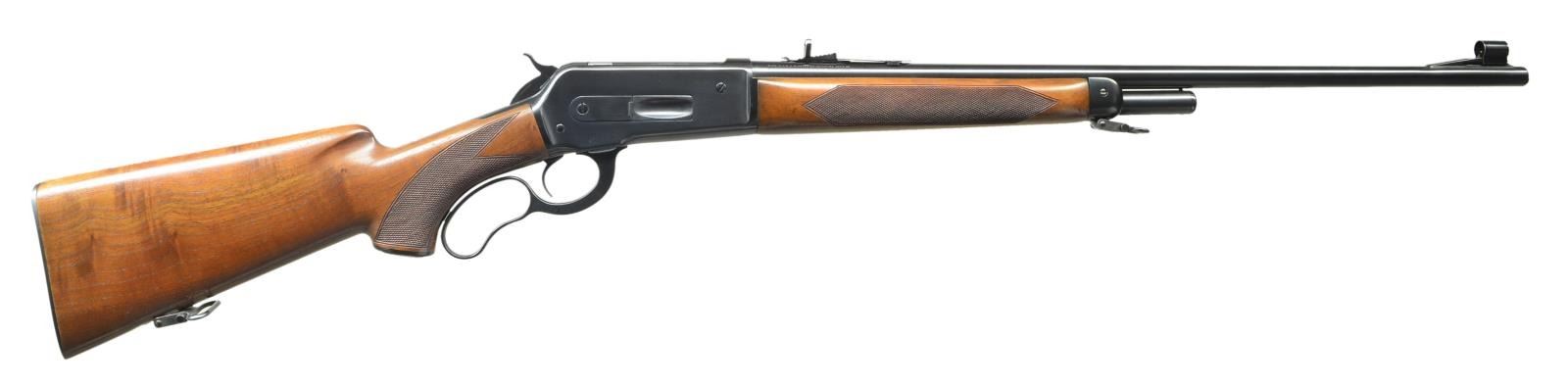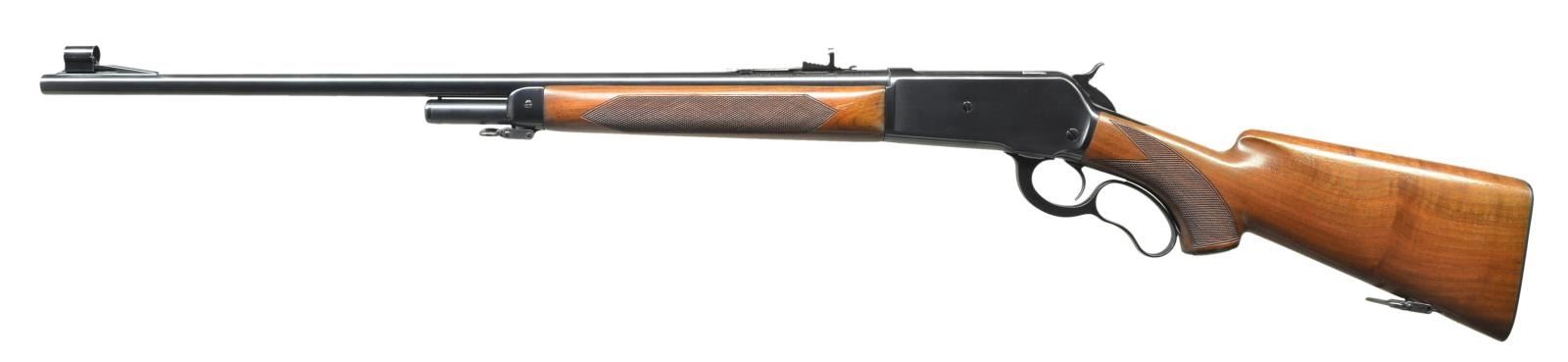 Cal. 348 WCF. S#. 2994. Bbl. 24". Hooded ramp replacement gold bead front & King semi-buckhorn elevator adj. rear sight. Half length mag. Long tang action. Semi beavertail forend & hard rubber capped pistol grip stock. Features include hand checkering, Super grade swivels. & checkered steel buttplate. Mfg. 1936. CONDITION: Nicely restored rifle. Over 98% reblued metal finish. Stocks have good refinish with freshened checkering. Bright bore retains sharp rifling. (22-2688/DS). CURIO. $1750-2500.