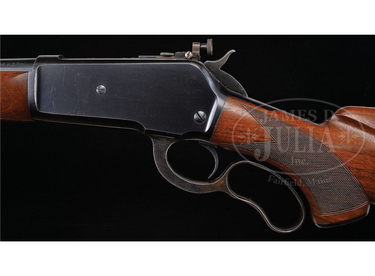 SN 19116. Cal. 348. Fine deluxe rifle with 24" tapered rd bbl, half magazine, ramp front sight with hood, slot blank in the rear seat & a bolt peep sight. Mounted with nicely figured straight grain American walnut that has checkered beavertail forearm & capped pistol grip stock with checkered steel buttplate. Buttstock & forend cap have deluxe sling swivel bases containing orig swivels & a leather sling. The Model 71 was in production from late 1935 until 1958 when the model was discontinued after only 47,254 were produced. No production or shipping records are available but it is believed that the deluxe version of this rifle was produced in substantially fewer numbers than the standard grade version. The total production numbers include not only standard grade and deluxe rifles, but also standard grade and deluxe carbines. A few were produced in cal 33 WCF & 45-70. CONDITION: Extremely fine plus. Overall retains about 98% crisp, orig factory blue with faint sharp edge wear, some slight freckling discoloration on the belly of the receiver with dull flaking on the forend cap and lever. Wood is sound showing slight dulling on the forearm otherwise retains virtually all of it's crisp orig finish. Mechanics are crisp. Brilliant, shiny bore, may have been fired, but if so, very little. Sling is fine. 4-48714 JR155
