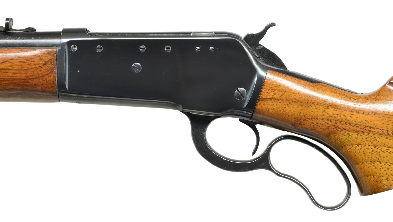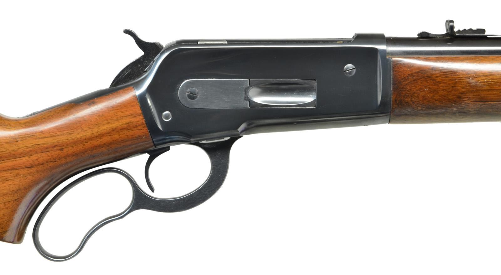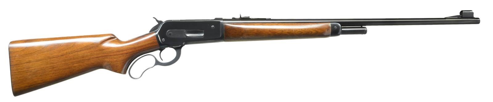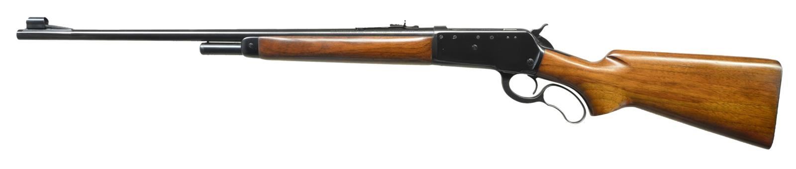 Cal. 348 Win. S# 14819. Bbl. 24" tapered round. Hooded ramp bead front with sporting nrear sights. 2/3 length mag. Short tang action has 4 extra plugged hole for scope attachment on left side. Semi beavertail forend & pistol grip walnut stock with with checkered steel buttplate. Mfg. 1939. CONDITION: Rifle shows very little use with over 98% original blue. Verg good original; wood finish. Bright near excellent bore. (22-4543/DS). CURIO. $1400-1900.