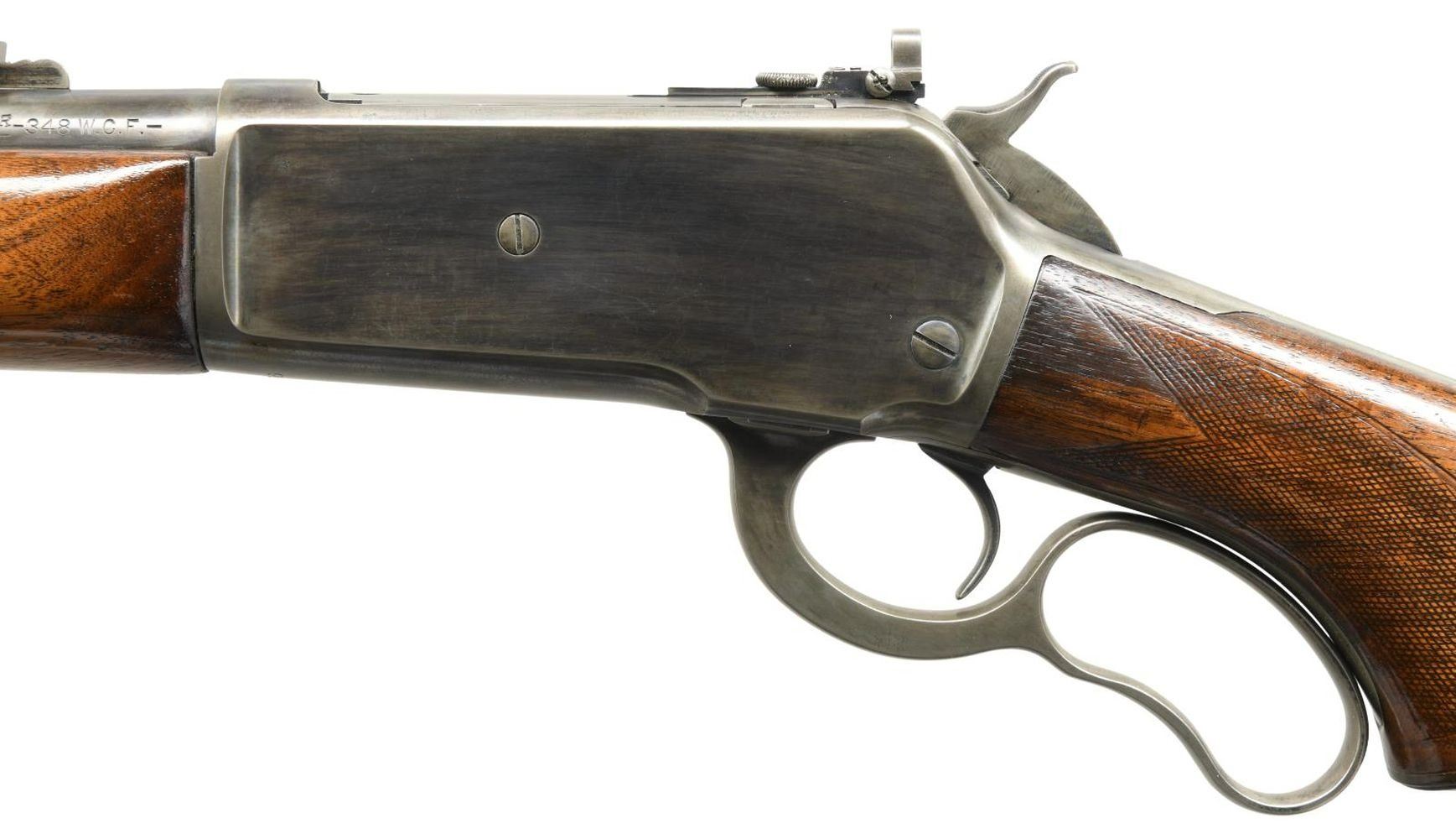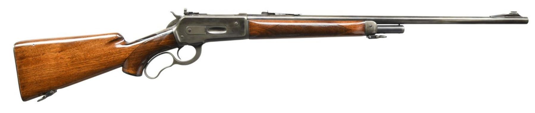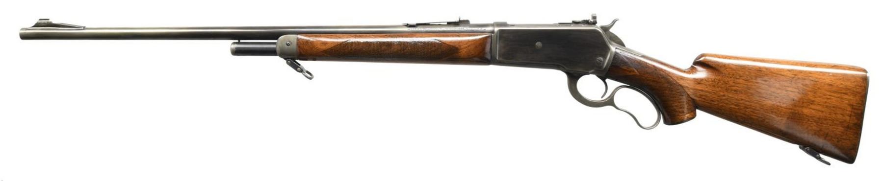 Cal. 348 WCF. S# 12376. Bbl. 24". Model 71 lever action rifle mfg. by Winchester in 1937. Left side of bbl. exhibits the model designation, followed by the Winchester trademark logo, as well as the cal. designation. Metal components exhibit a blued finish. Checkered wood pistol grip buttstock & forend exhibit a layer of thick lacquer overall. Ramped brass beaded front sight w/ U-notch rear sight & bolt mounted aperture rear sight. CONDITION: metal components retain little of their original factory blue finish, exhibiting wear & thinning overall that shows through to brown & gray patina. Mirror bore, exhibiting well defined rifling throughout. Wood furniture shows scattered marks & a couple minor impressions from storage & handling, but otherwise remains sturdy & serviceable. (23-5729/MLW). CURIO. $700-1,000.