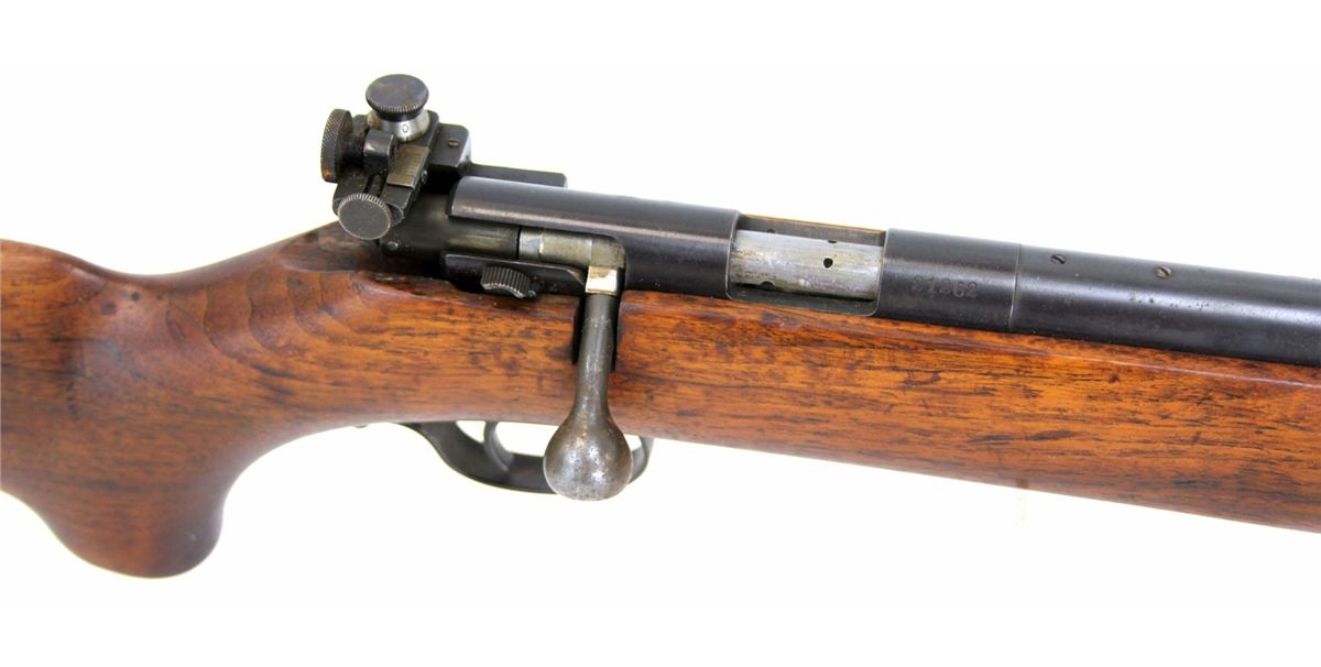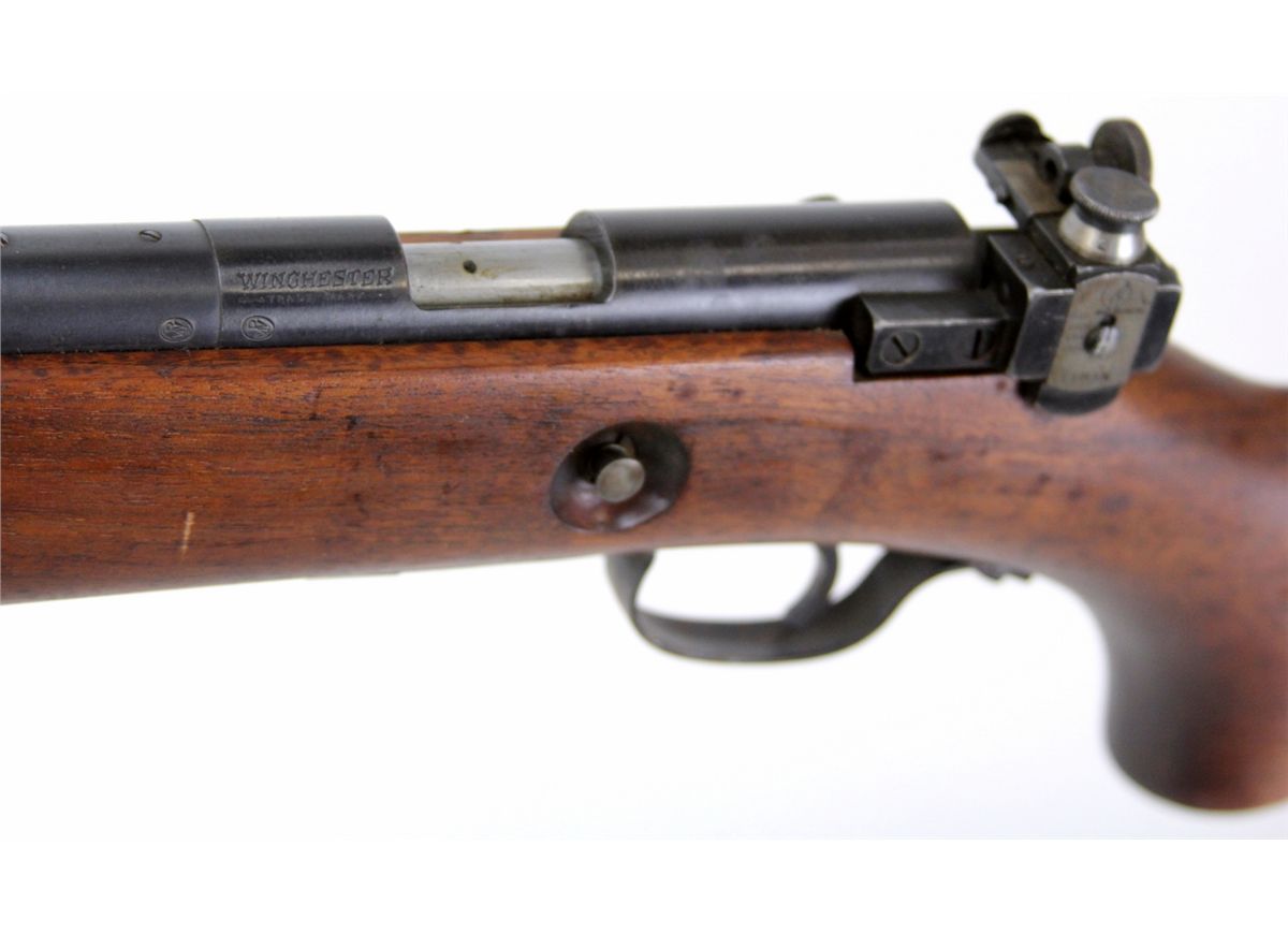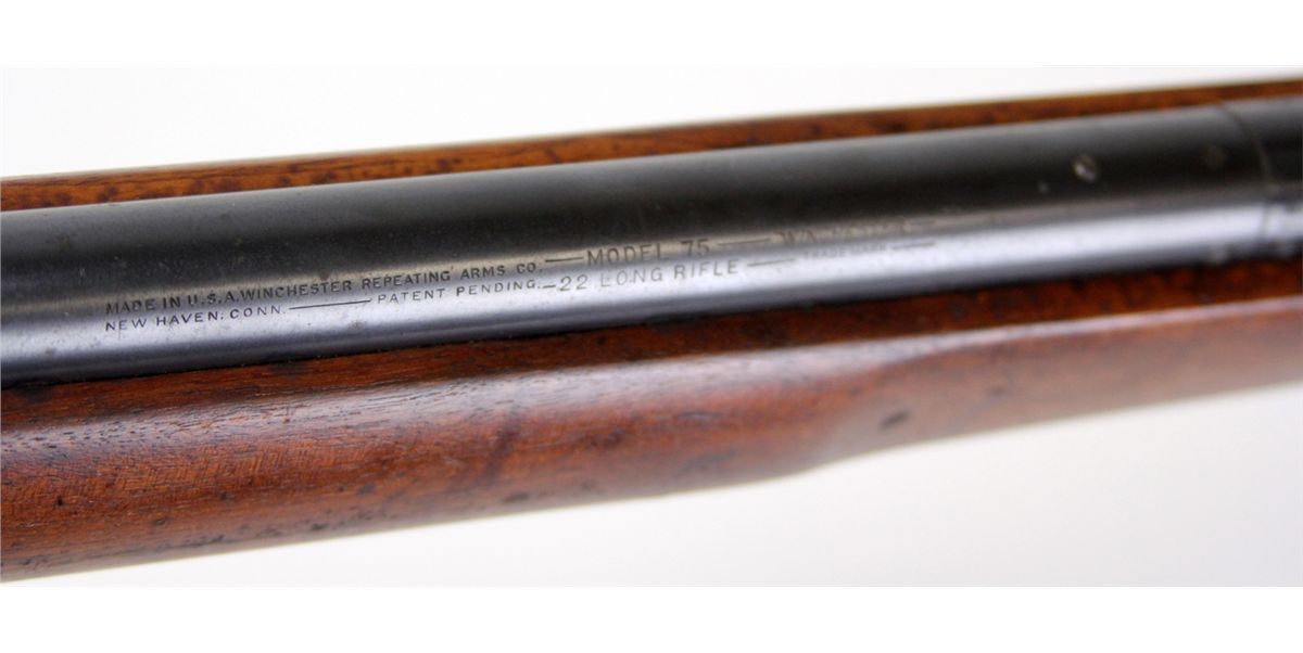 WINCHESTER MODEL 75 22 CALIBER TARGET RIFLE Manufactured in 1941. Lyman sight. Type: Rifle Manufacturer: Winchester Model: 75 Caliber / Gauge: .22 Barrel Length: 28" Serial Number: 21262 Condition: Bore is very good. Finish is 85% blue with some scratches. 90% overall.