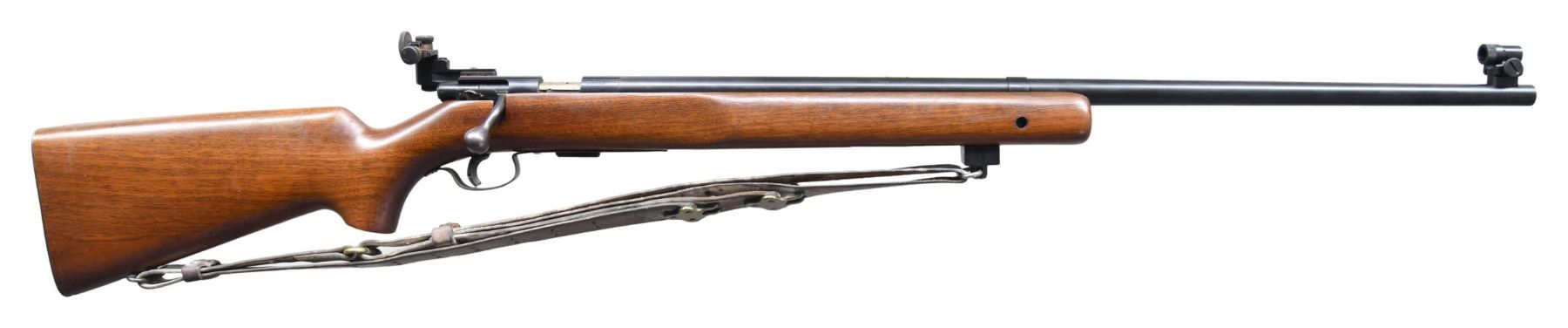 Cal. 22 LR. S# 85835. Bbl. 28". Model 75 bolt action target rifle mfg. by Winchester in 1956. The left side of the bbl. is marked with Winchester's mfg. information, followed by the model and cal. designations, as well as the Winchester trademark logo. Left side of the receiver is marked with the Winchester trademark, with the S# marked on the right. Metal components exhibit a blue finish overall, save for on the bolt body, which is polished in-the-white. 1-piece plain wood pistol grip target stock, with blued steel hand stop rail and flat checkered steel buttplate. Globe front sight, with Redfield adj. aperture rear sight. Rifle is mounted with a period brown leather sling. MAGS: 1 5-rd. CONDITION: very good, with metal components retaining the vast majority of their original factory blue finish, exhibiting some scattered superficial handling marks, with some spots of light pitting and light to mild surface oxidation present on the underside of the bbl. Mirror bore, exhibiting well defined rifling throughout. Stock shows some scattered superficial marks and minor impressions from handling and storage, but is otherwise very good overall. Leather sling remains malleable, exhibiting consistent wear, with scattered areas of light age related cracking and crazing present overall. PROVENANCE: Estate of Russell Dickerman. (25-1848/MLW). CURIO. $400-600.