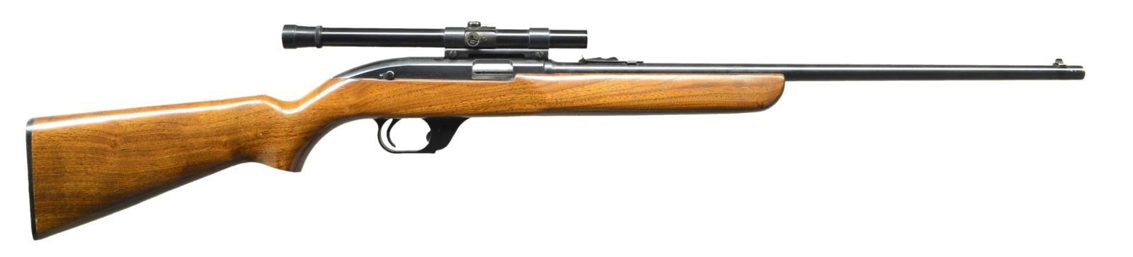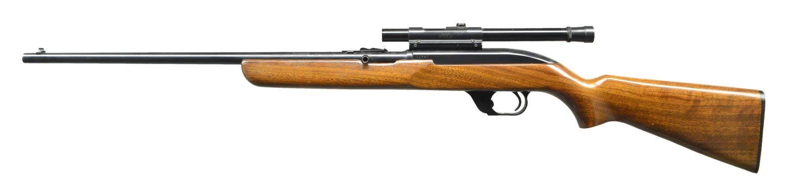 Cal. 22LR. S# 11757. Bbl. 22". Mfg. 1955-1963. Self loading, magazine fed, rimfire rifle. Blued finish on exposed metal surfaces. Front blade w/ bead, Elevation adjustable rear sight. Left side reciprocating charging handle. Right side toggle safety on receiver above trigger. Full length hardwood stock w/ black plastic Winchester checkered butt plate. Dovetailed receiver currently sporting Weaver mount & Weaver B4 scope w/ fine crosshair. CONDITION: Finish coverage remains complete & consistent w/ a few light scratches. Stock exhibits only a few light impressions, in areas typically associated w/ vertical rack storage. No magazine. Scope glass is clear w/ tight reticle. Bright bore w/ descent rifling. Fire control mechanism appears to function correctly when cycled by hand. (22-3230/JZ). CURIO. $300-400