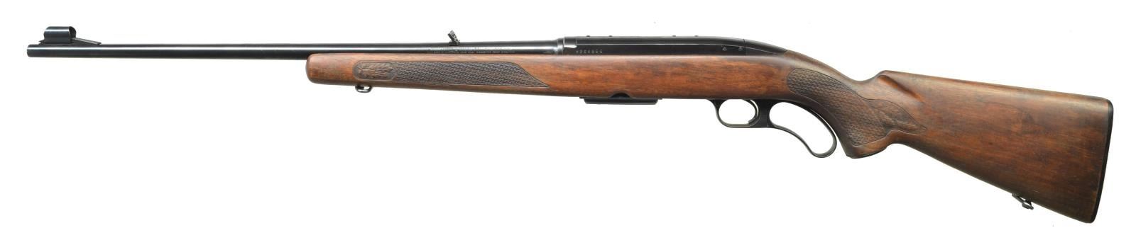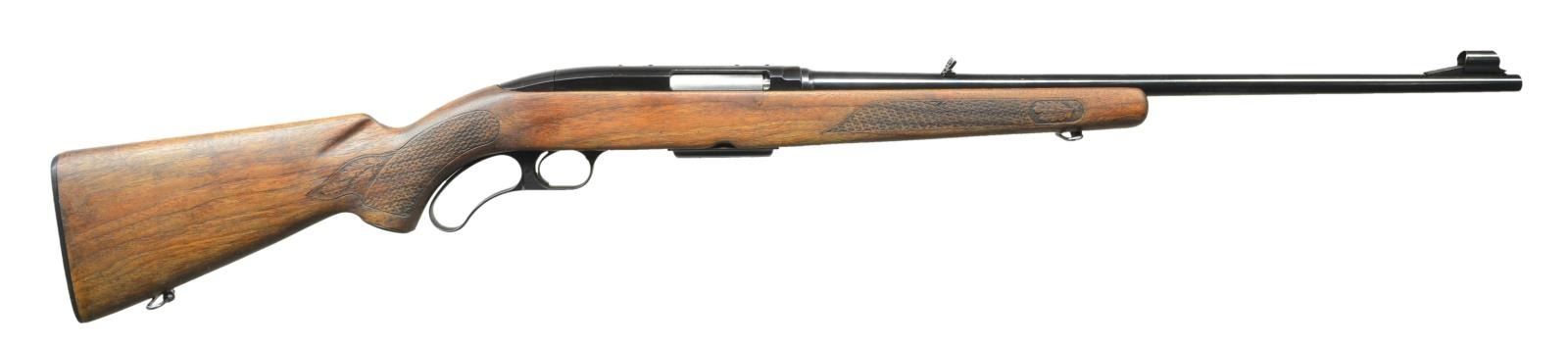 Cal. 308 Win. S# H264866. Bbl. 22" w/ factory ramped front sight having hood plus folding leaf rear. Mfg. 1971 (1955-1973) w/ basket weave pattern walnut stock having factory swivels, metal grip cap and checkered black plastic buttplate. MAGS: 1 very good factory 5 rd. CONDITION: very good to excellent overall appearance w/ nicely refinished stock having dark satin tone. Near excellent original finish of blued metal. Near excellent bore. (22-5583/NW). CURIO. $650-900.
