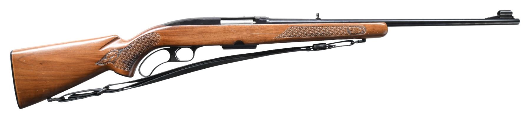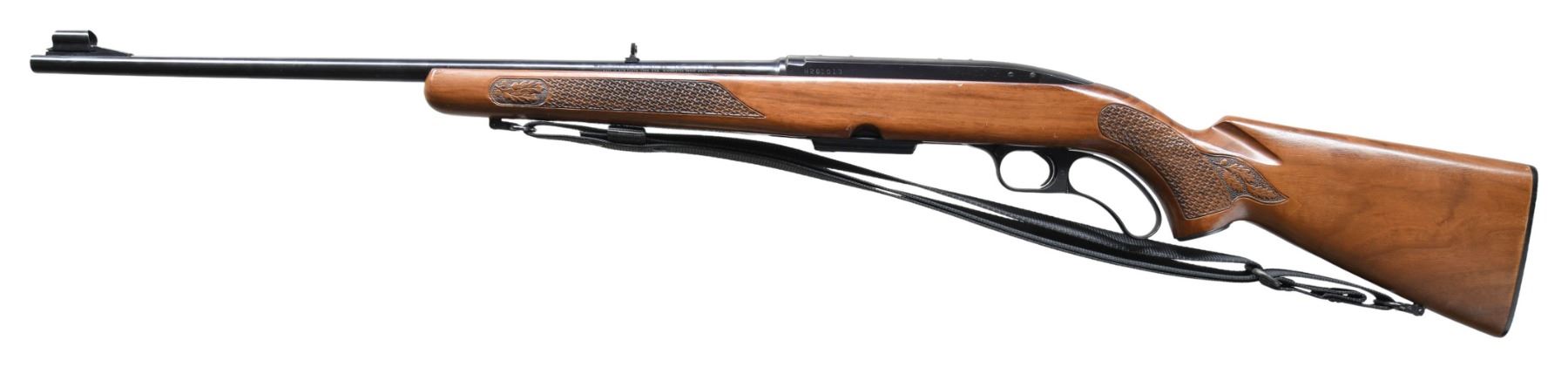 Cal. 308 Win. S# H261013. Bbl. 21 3/4". Model 88 lever action rifle mfg. by Winchester in 1971. Left side of the bbl. exhibits standard markings denoting Winchester's mfg. information, as well as the model and cal. designations. Metal components exhibit a blue finish overall, save for on the bolt, which is polished in-the-white. 1-piece pistol grip wood stock exhibits acorn and oak leaf woven panels at the wrist and forearm, with a checkered black synthetic buttplate. Ramped and hooded aluminum beaded blade front sight with flip-up U-notch rear sight. Receiver is factory drilled and tapped with plug screws. Unmarked black nylon sling. MAGS: 1 4-rd. CONDITION: metal components retain the vast majority of their original factory blue finish, exhibiting some superficial handling marks overall. Mirror bore, exhibiting some hardened grease, while retaining well defined rifling throughout. Proper manual mechanics. Stock shows scattered marks and scratches, but otherwise remains sound. (25-3749/MLW). CURIO. $350-550.