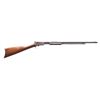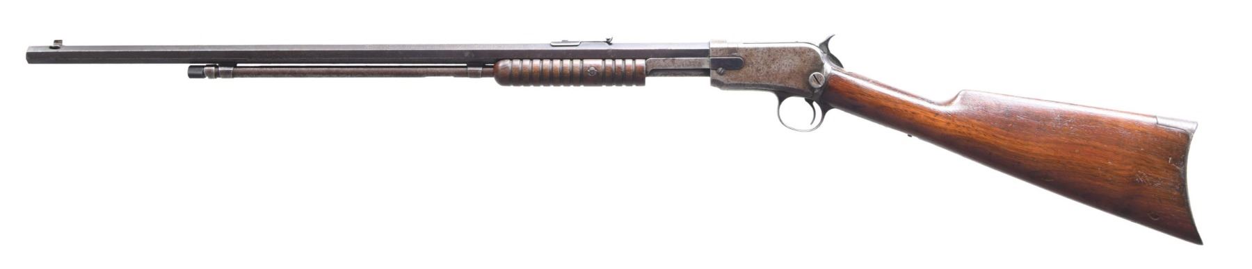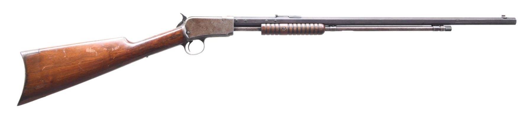 Cal. 22 Short. S# 704802A. Bbl. 24" octagon w/ original sporting sights. Tubular mag. Grooved slide handle & straight grip walnut stock w/ crescent steel buttplate. Mfg. 1927. CONDITION: bbl. has 60% dull faded blue showing spotted corrosion. Right flat has 4 added holes w/ plug screws for apparent scope mount attachment. Action & mag. tube have faded to gray showing brown corrosion. Wood has added finish over dents, scratches & handling marks. Bore has lightly worn rifling. (24-5133/DS). CURIO. $300-500.