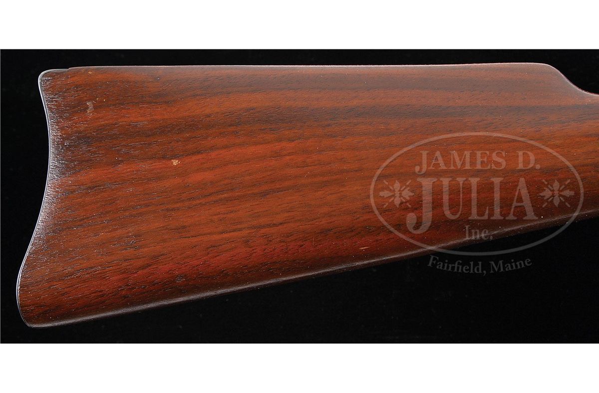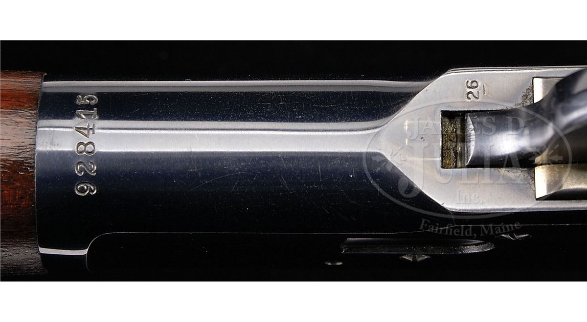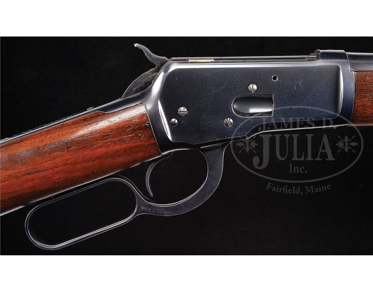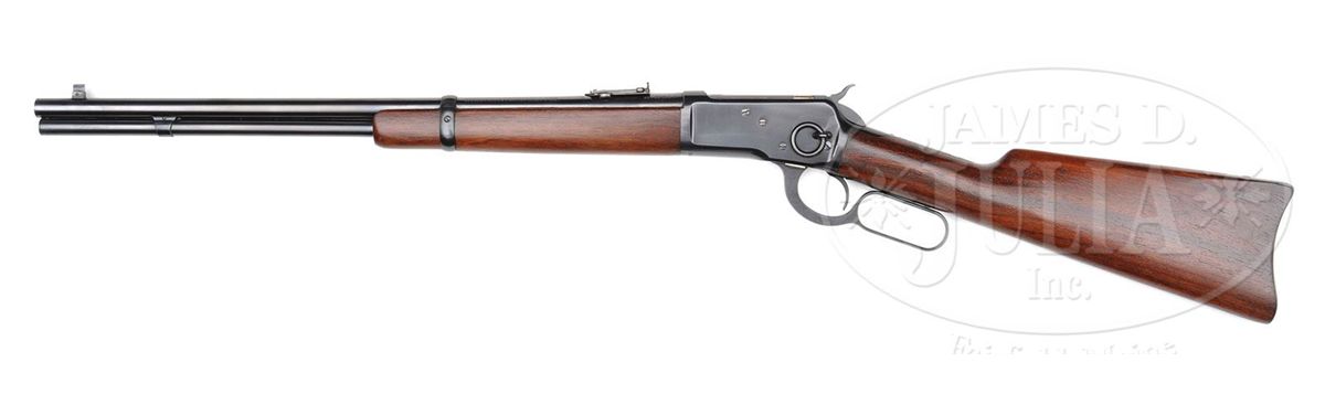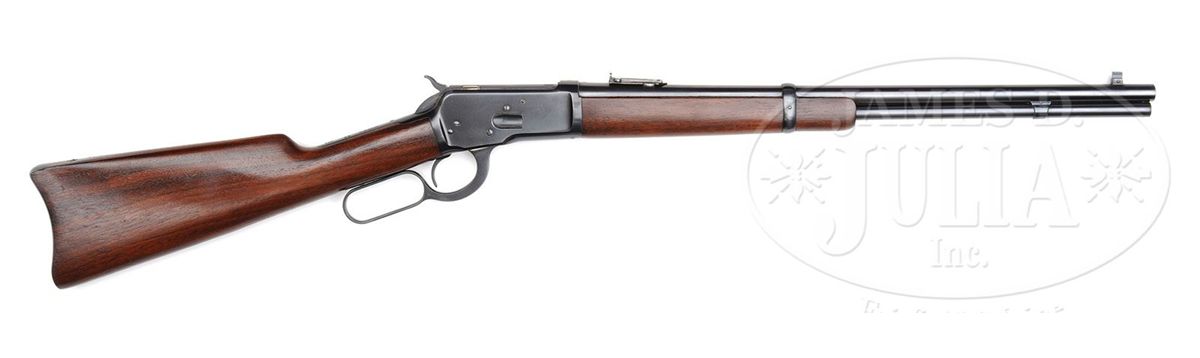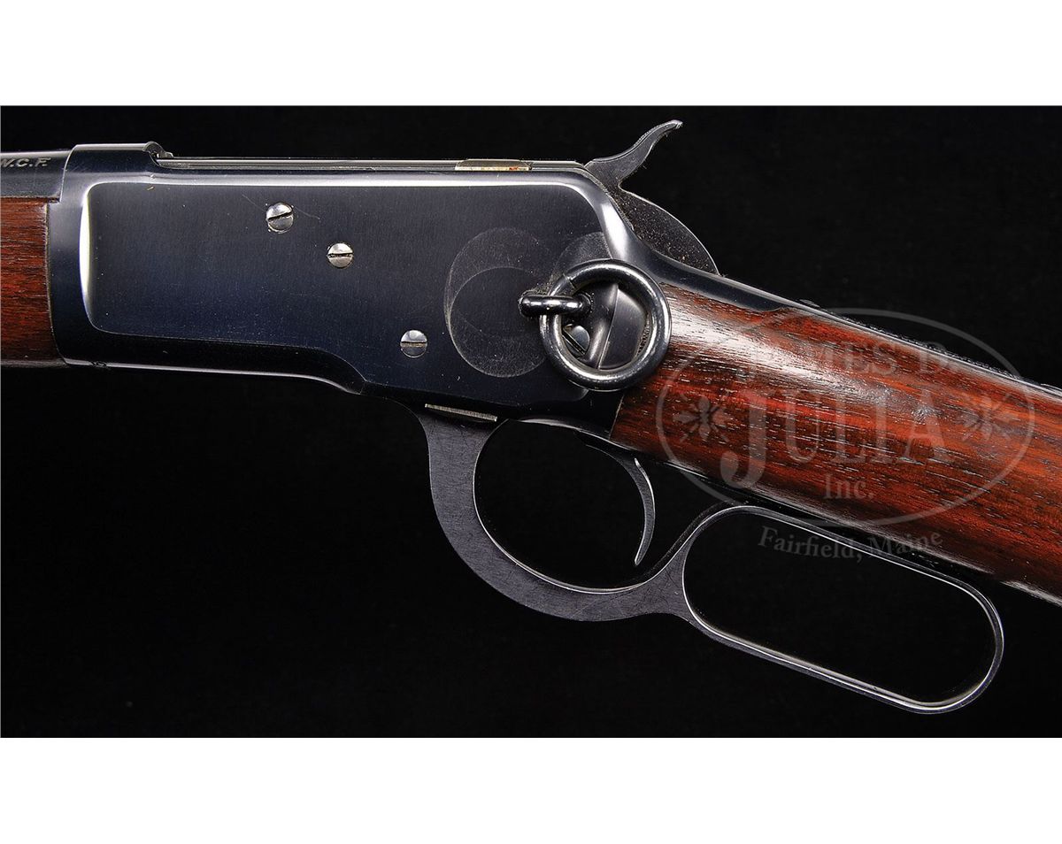 SN 928415. Cal. 25-20 WCF. Standard grade carbine with 20" rnd bbl, full magazine, gold bead front sight in square base & 2000 yd. carbine ladder rear sight. Left side of receiver has a staple & ring. Mounted with nicely figured, straight grain, uncheckered American walnut with straight stock and carbine buttplate. These small bore carbines were generally considered to be ladies or boys rifles and usually were treated as such and in the hands of these less experienced shooters, usually saw very hard use with little or no maintenance, and are rarely found today with high orig finish. PROVENANCE: Woody Frey Collection. CONDITION: Extremely fine plus, all orig. Overall the metal retains about 98% crisp, orig blue with a light halo from the saddle ring & very faint sharp edge wear. Loading gate retains virtually all of its orig finish. Wood is sound with 1 or 2 extremely small handling & storage marks, nearly flawless. Appears to be new & unfired. 4-48453 JR220