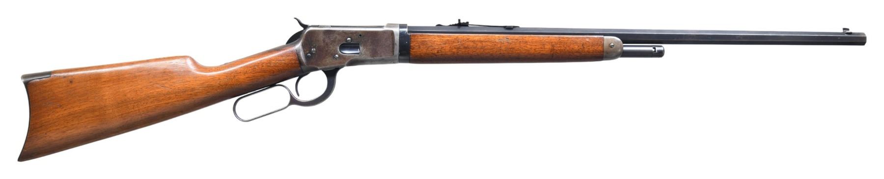 Cal. 44 WCF (44-40). S# 922615. Bbl. 24" octagon, with sporting front sight and flat top sporting rear sight. Half-length mag. Blue finish. Walnut forearm and straight grip stock, with crescent steel buttplate. Mfg. in 1923. CONDITION: bbl. and mag. tube retain over 80% lightly faded blue, showing edge wear, with spots of very light pitting. Receiver retains small amounts of blue, with balance fading to silver/gray due to flaking which is common for this time frame. The high nickel content in Winchester receivers manufactured in the late teens and early 20s hindered the long term adherence of bluing to the metal, it is not uncommon to find an example in high original condition in all aspects other than the receiver. Original wood finish shows scattered light scratches and marks. Mechanically fine. Very good bright bore. (25-1749/DS). CURIO. $3,000-4,500.
