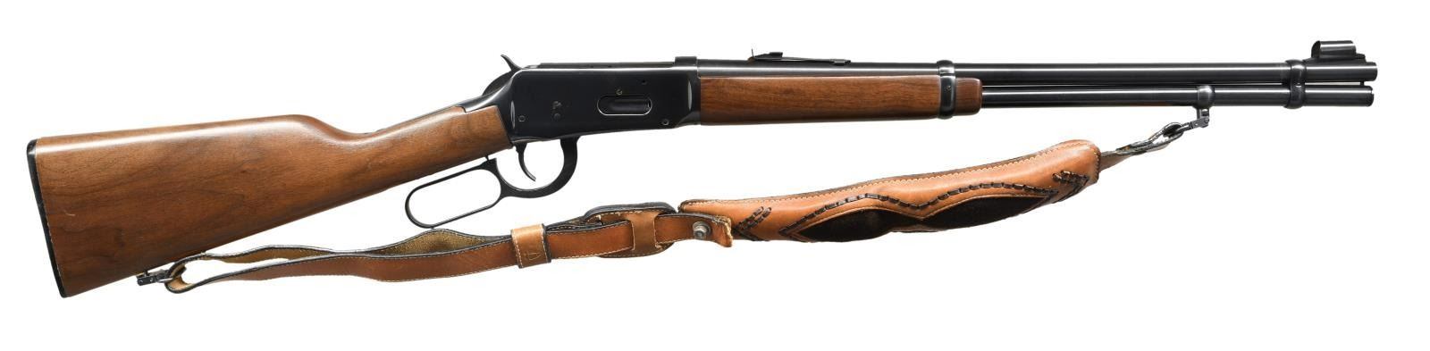 Cal. .30-30 W.C.F. S# 4077646. Bbl 20". Mfg. in 1974. Blued finish w/ smooth wood buttstock and forend. Checkered black plastic buttplate. Hooded blade front sight w/ U-notch rear sight. Stalker brown leather sling. CONDITION: metal components retain the majority of their original factory blue finish, exhibiting mild wear, some scattered superficial marks from handling and storage, as well as light surface oxidation that is mainly present on the receiver and lever. Mirror bore, exhibiting well defined rifling throughout. Wood furniture shows some light marks from storage and handling, but is otherwise very good. Leather sling is torn, but bears a homemade repair. (23-2225/MLW). MODERN. $300-500.