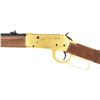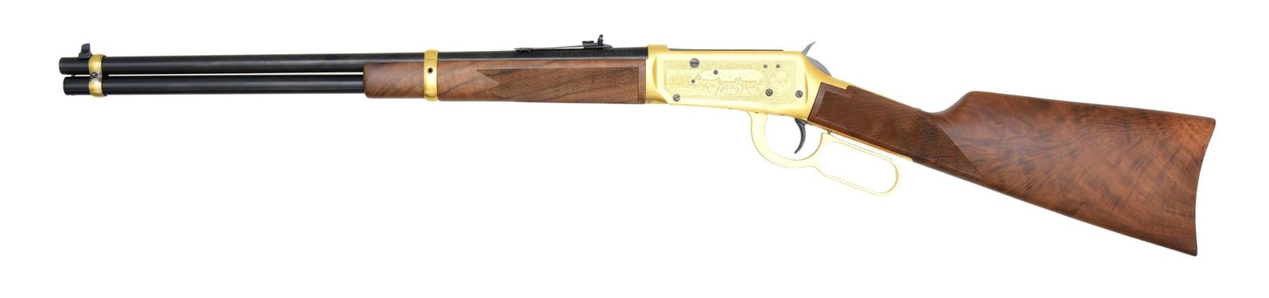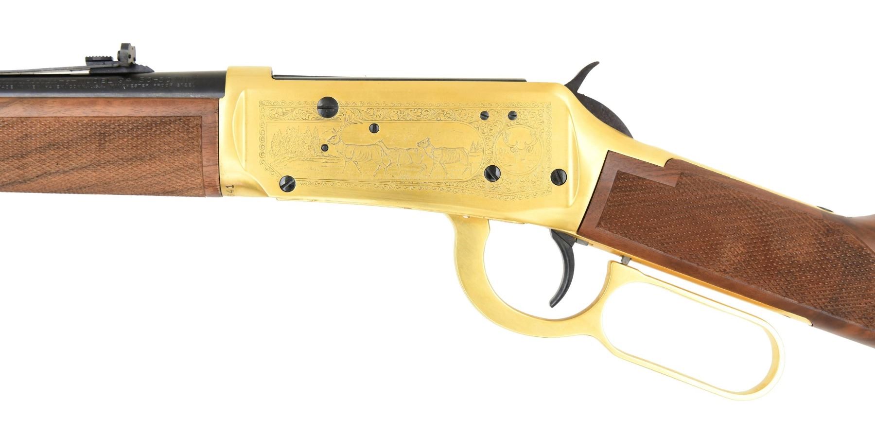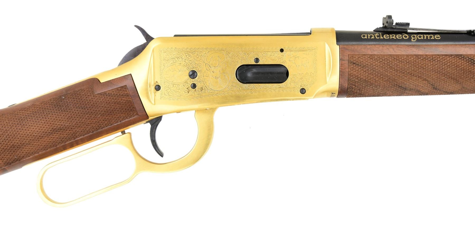 RIFLE WITH MATCHING FACTORY INSERT & SLEEVE. Cal. 30-30. S# AG03641. Bbl. 20". Model 94 Antlered Game lever action carbine mfg. by Winchester. Left side of the bbl. is marked with the Winchester trademark logo, followed by the model and cal. designations above Winchester's mfg. information, with "antlered game" marked on the right in gold characters. Sides of the receiver feature scroll engraving with scenes of North American game, including caribou, whitetail deer, moose, elk, and mule deer. Receiver, lever, and bbl. exhibit a gold washed finish, with the bolt, hammer, receiver screws, trigger, bbl., mag. tube, and buttplate exhibiting a blue finish overall. Satin-finished checkered wood straight grip buttstock and forend. Blade front sight with U-notch rear sight. Rear bbl. band screw is absent. UNATTACHED ACCESSORIES: matching factory styrofoam insert and sleeve. CONDITION: excellent, with metal components retaining bountiful amounts of their original factory finishes, with the front bbl. band exhibiting areas of tarnishing. Mirror bore, exhibiting some grease while retaining well-defined rifling throughout. Wood furniture is excellent overall. Cardboard sleeve shows some light to mild exterior wear from handling and storage but otherwise remains sturdy and serviceable. (24-3553/MLW). MODERN. $500-800.