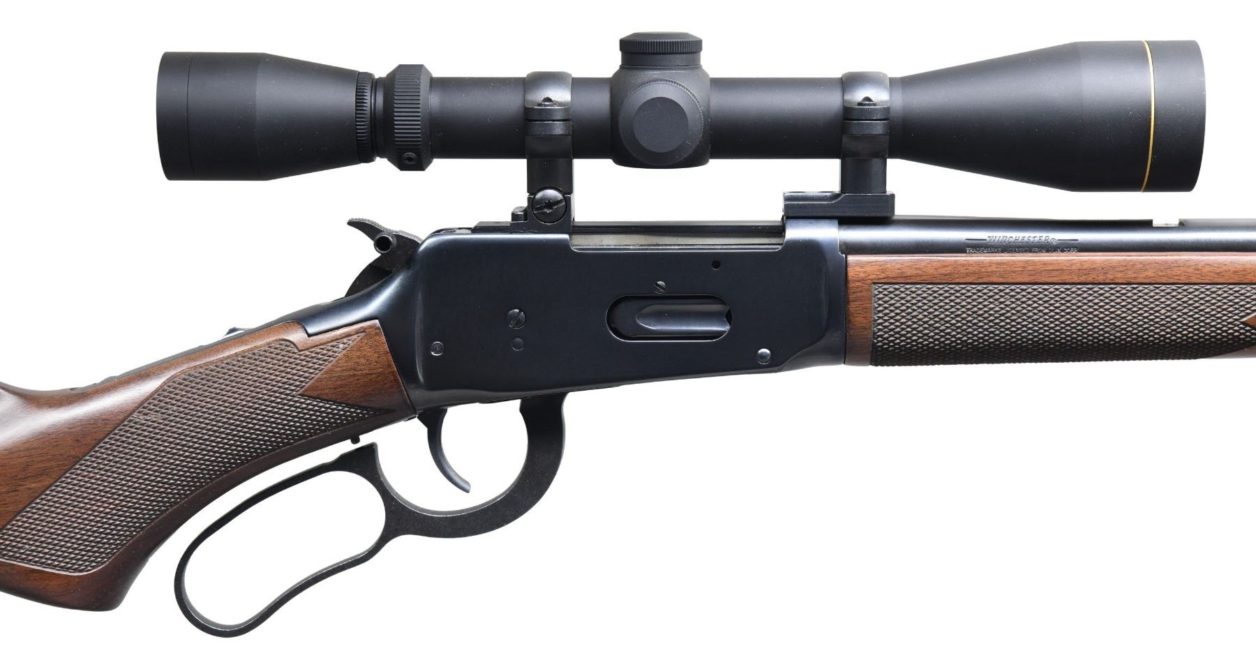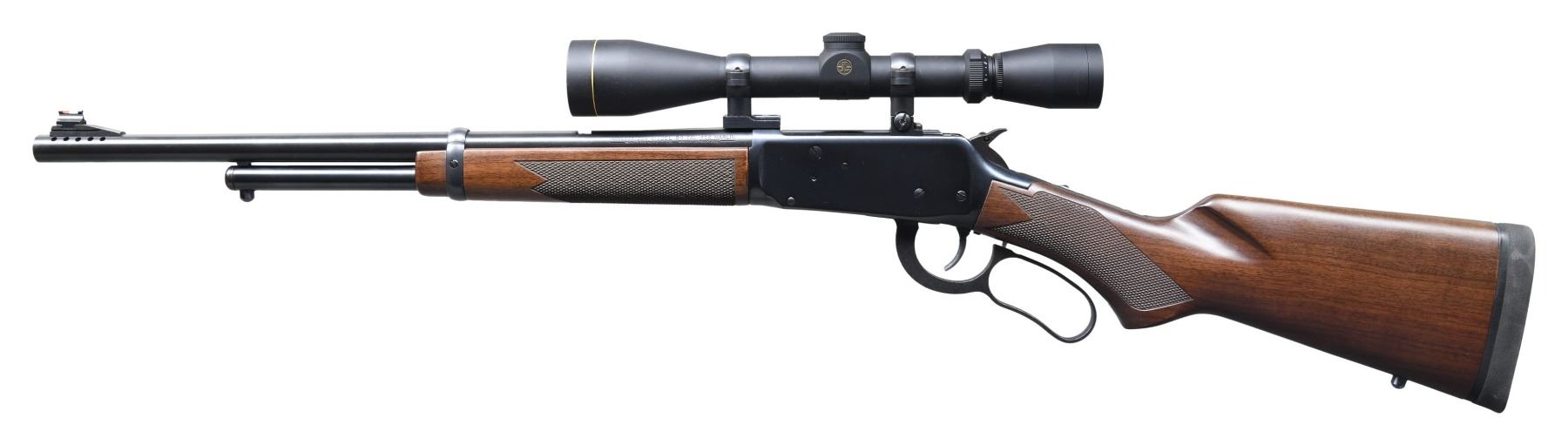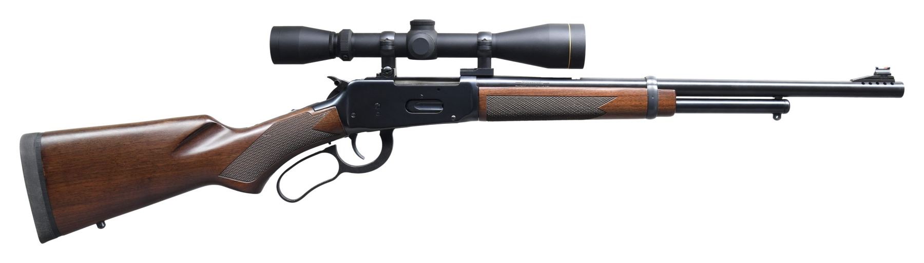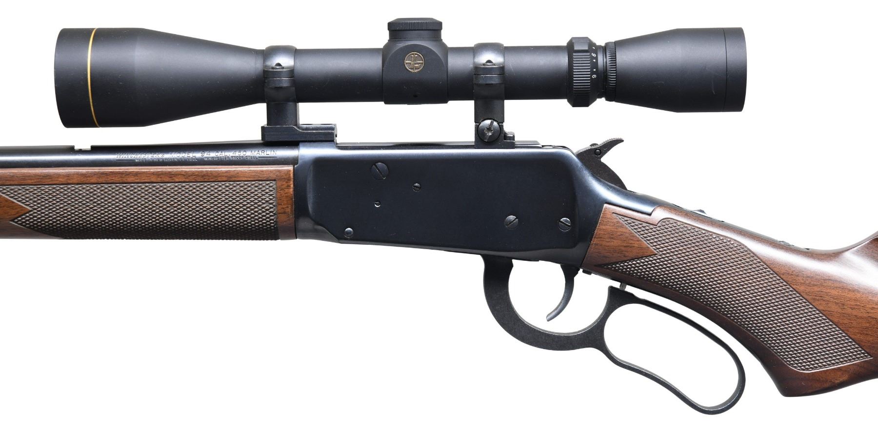 Cal. 450 Marlin. S# 6525191. Bbl. 18" rnd, ported at muzzle. Ramp mounted fiber optic front sight, orange bead is broken. Open dovetail for rear sight. Leupold VX-1 3-9X40mm matte finished scope with duplex reticle on 2-piece Leupold mounts. Angle eject action has top tang safety and hammer extension. 3/4 length tubular mag. Blue finish. Band fastened forearm and pistol grip walnut stock have cut checkering. LOP: 13 5/8" over a solid black Decelerator pad. Toe line of stock and mag. cap have sling swivel bases. CONDITION: near excellent retaining over 98% original blue. Original wood finish shows small marks and wear spots. Bright near excellent bore. (25-4012/DS). MODERN. $800-1,200.