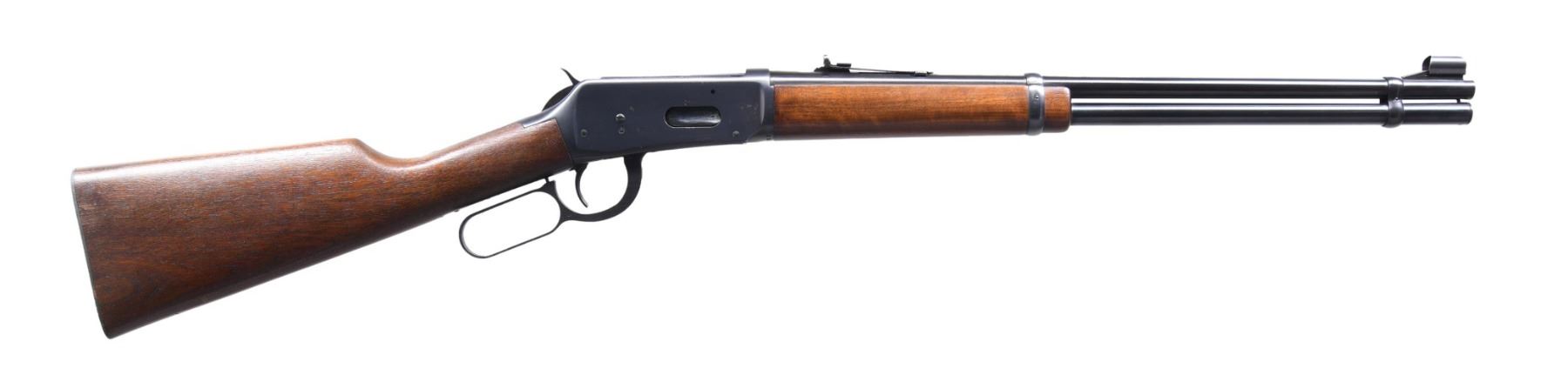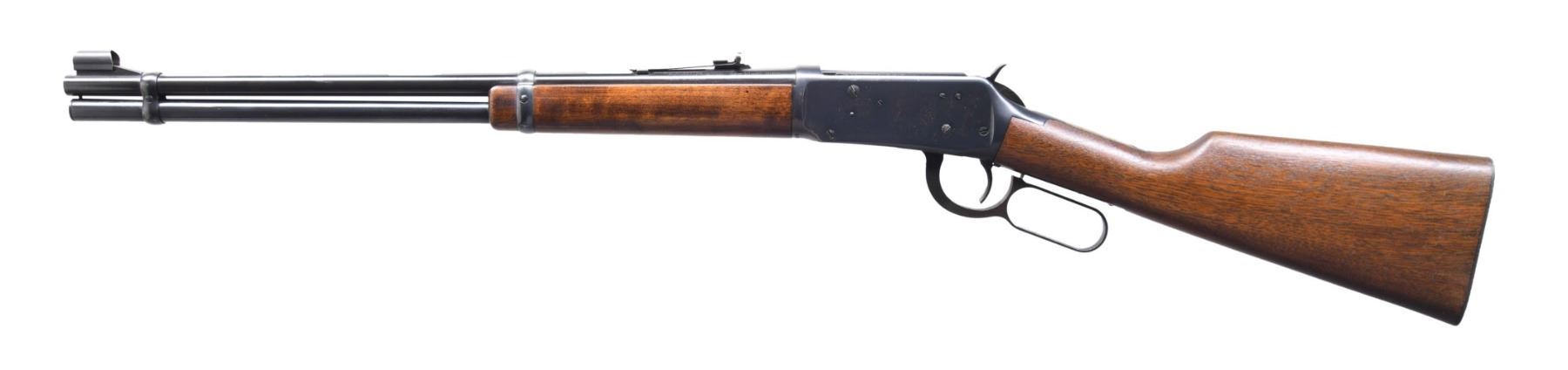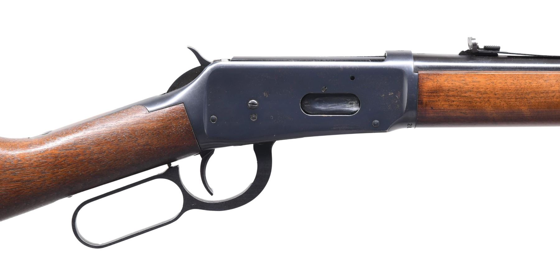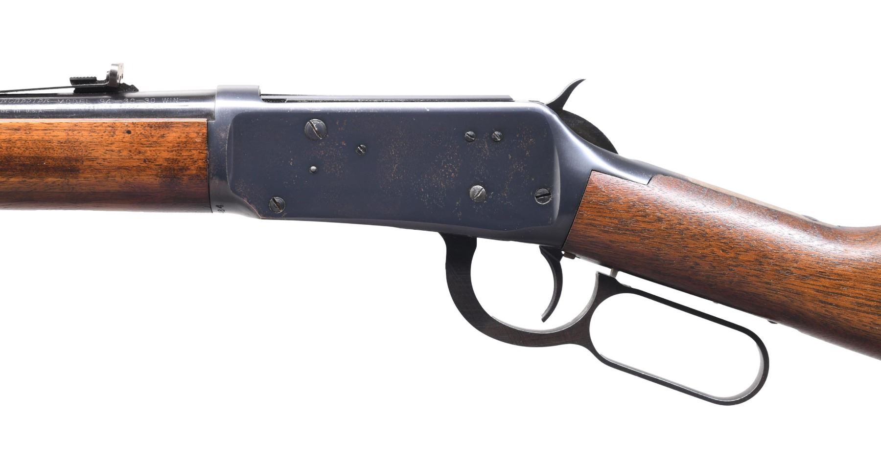 Cal. 30-30. S# 2838484. Bbl. 20". Model 94 lever action rifle mfg. by Winchester in 1965. Left side of the bbl. is marked with the Winchester trademark logo, followed by the model and cal. designations. Metal components exhibit a blue finish overall. Plain wood straight grip buttstock with flat inverse checkered buttplate and plain wood forend. Stock appears to have been sanded and revarnished at one time. Ramped and hooded blade front sight, with U-notch rear sight. Grooved hammer. CONDITION: metal components retain the majority of their original factory blue finish, with the receiver exhibiting some areas of wear and thinning, as well as scattered spots of light surface oxidation overall. Upper receiver tang exhibits wear through to a mostly gray patina. Mirror bore, exhibiting what appears to be a few spots of mild oxidation while retaining well-defined rifling throughout. Wood furniture shows some superficial marks from handling and storage but otherwise remains sturdy and serviceable. (24-5889/MLW). CURIO. $400-600.