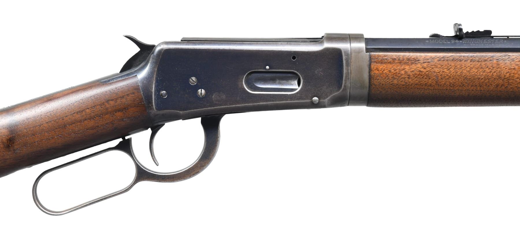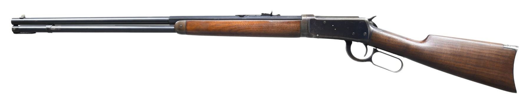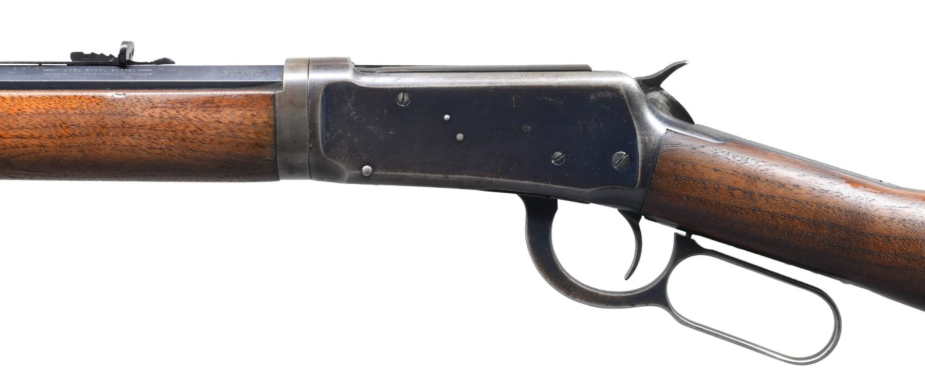 Cal. 30 WCF (30-30). S# 1068436. Barrel 26" half octagonal with full length mag. Sporting sights. Blue finish. Walnut forearm and straight grip stock with crescent steel buttplate. Mfg. in 1929. CONDITION: bbl. and mag. tube retain 90% original blue showing light edge wear with scattered spots of freckling. Mag. tube shows some light wear from takedown through the mag. tube band. Action retains 70% original blue showing edge and carry wear with small areas of scattered surface freckling. Stock and forearm show spots of original finish; balance shows age wear with scattered light scratches and marks. Left side of upper tang has a small well executed wood repair. Mechanically fine. Very good bright bore. (25-1753/DS). CURIO. $2,500-3,500.