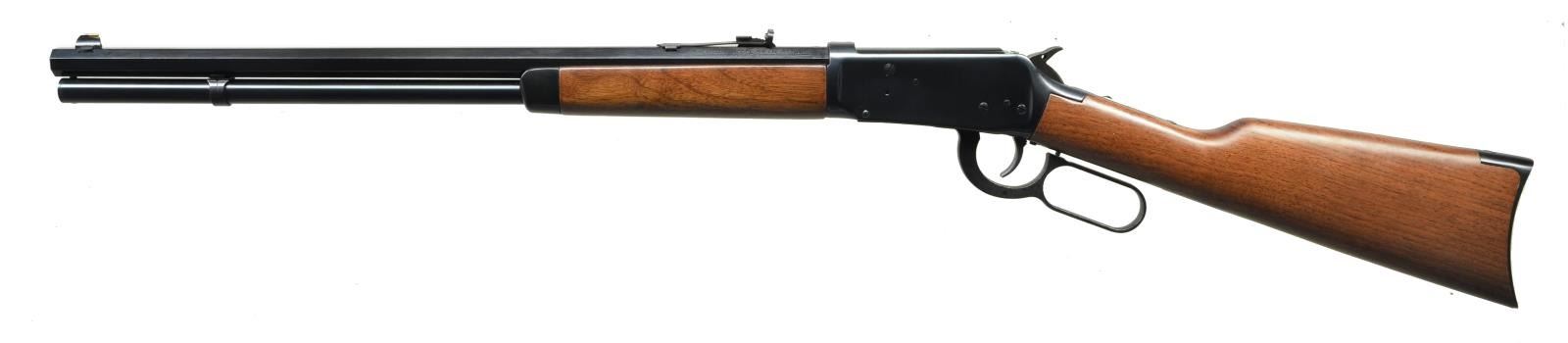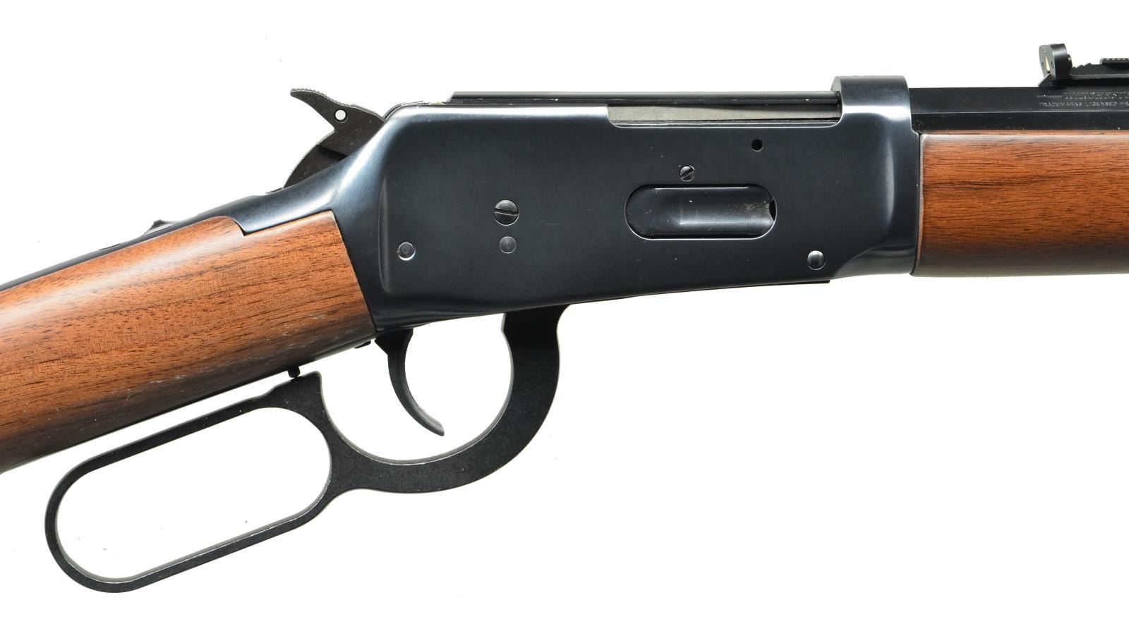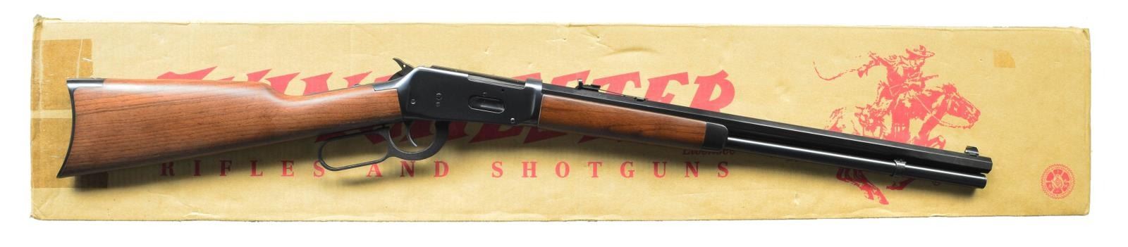 Cal. 357 Mag. S# 6533826. Bbl. 20" octagon with bead front sight and elevator adjustable sporting rear sight. Full length magazine. Angle eject action with top tang safety is drilled for scope mounts. Short rifle length walnut forearm and straight grip stock with crescent steel buttplate and satin finish. Mfg. 1997-2006 in USA. UNATTACHED ACCESSORIES: original foam lined box with matching label. Box contains owners manual, NRA card, hang tag, service center paper, congratulations note, hammer extension and padlock. CONDITION: as new with box. (22-4705/DS). MODERN. $800-1,200.
