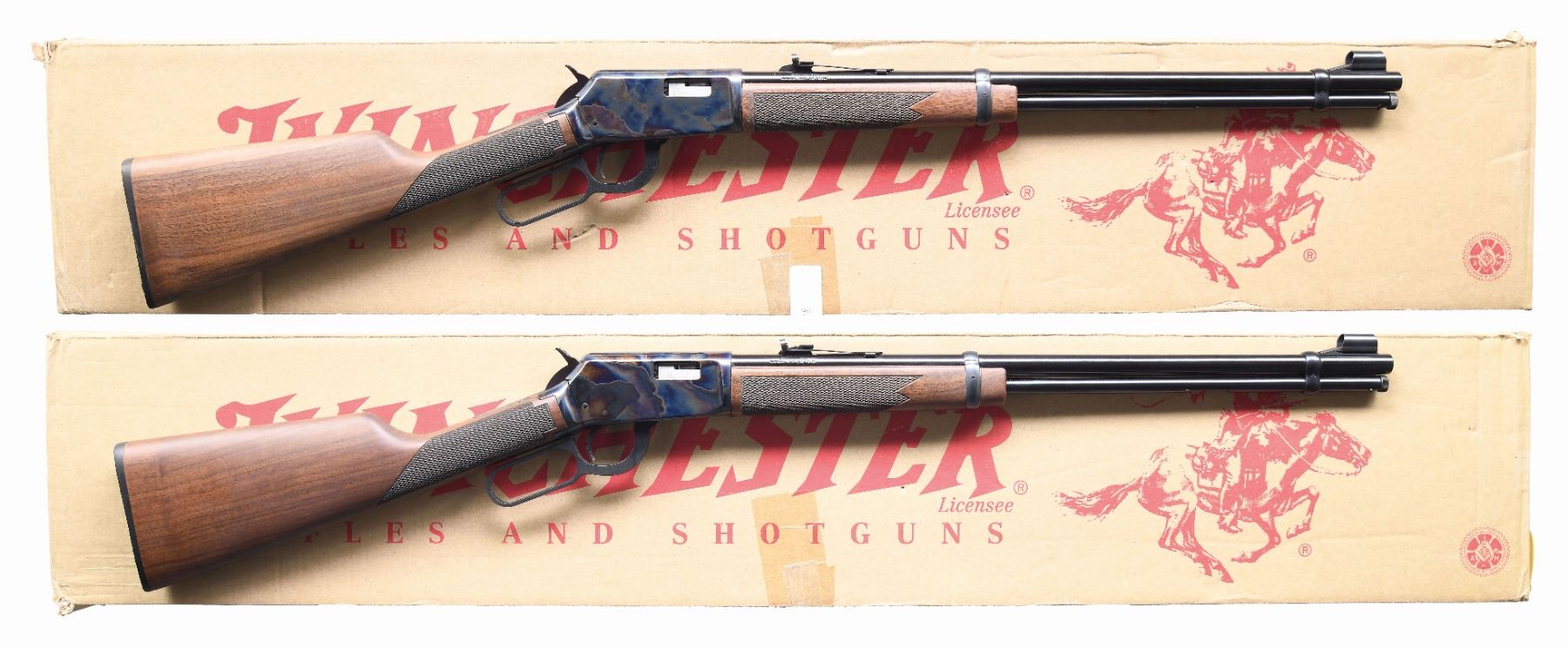 ACTION RIFLES. Both Cals. 22 L, LR. Traditional rifles w/ case colored actions. 20" blued bbls. w/ hooded ramp bead front sights & sporting rear sights. Full length mags. Band fastened forearms & straight grip walnut stocks w/ cut checkerings & plastic buttplates. GUN 1: S# F778142. UNATTACHED ACCESSORIES: original box containing owner's manual, hang-tag, repair center list, NRA card & safety lock. CONDITION: near new, appears unfired, retaining virtually all finish. GUN 2: S# F778141. UNATTACHED ACCESSORIES: original box containing owner's manual, hang-tag, purchase confirmation card, congratulations card, NRA card & safety lock. CONDITION: near new, appears unfired, retaining virtually all finish. (25-675 & 25-676/DS). BOTH MODERN. $2,000-3,000.