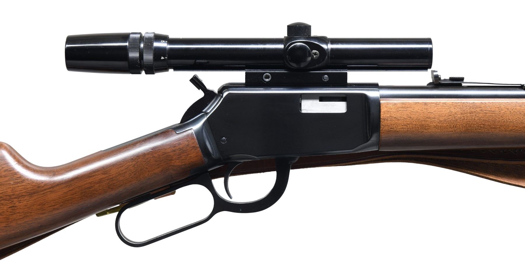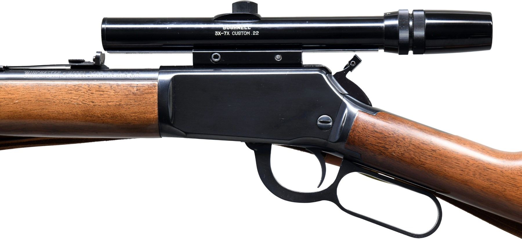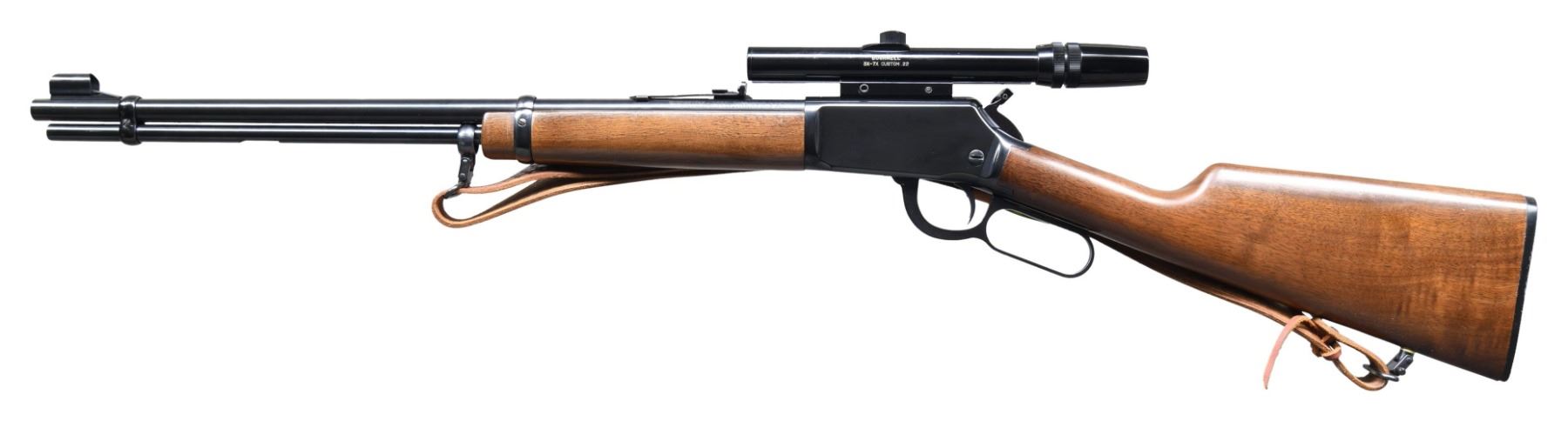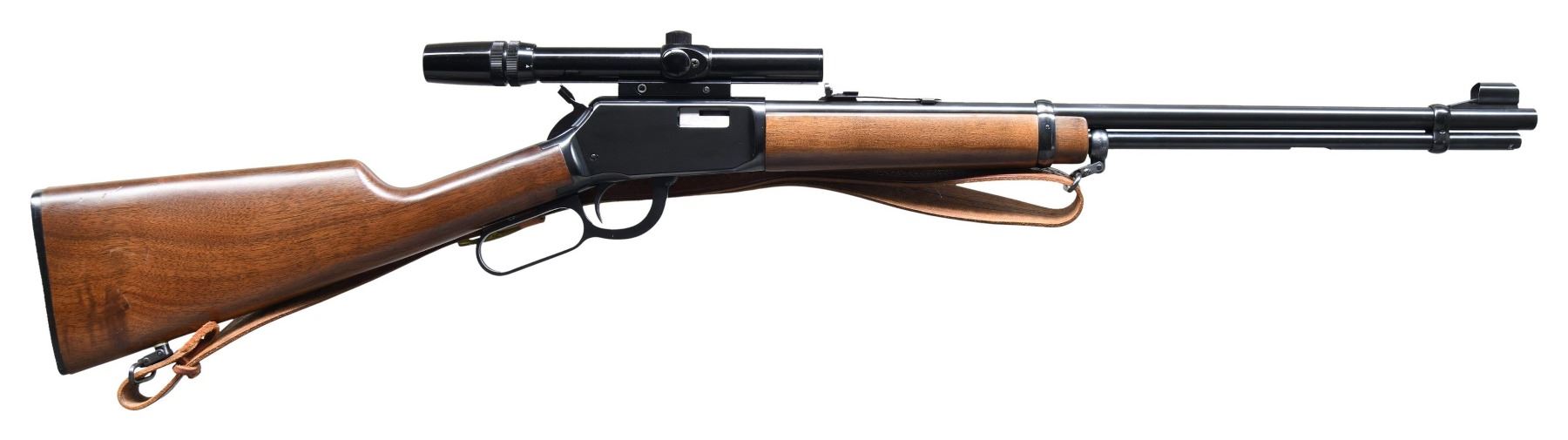 Cal. 22 S, L, LR. S# F23290. Bbl. 20" with hooded ramp bead front sight and sporting rear sight. Bushnell 3X-7X Custom 22 gloss finished scope with crosshair reticule on tip off mounts. Tubular mag., inside of mag. tube is not present. Blue finish. Action is fitted with a hammer extension. Band fastened carbine forearm and straight grip stock with plastic buttplate. Unmarked tooled leather sling on added QD swivels. CONDITION: over 95% blue. Original stock finish shows scattered scratches and marks. Very good bright bore. Scope has clear optics. (25-2708/DS). MODERN. $400-600.