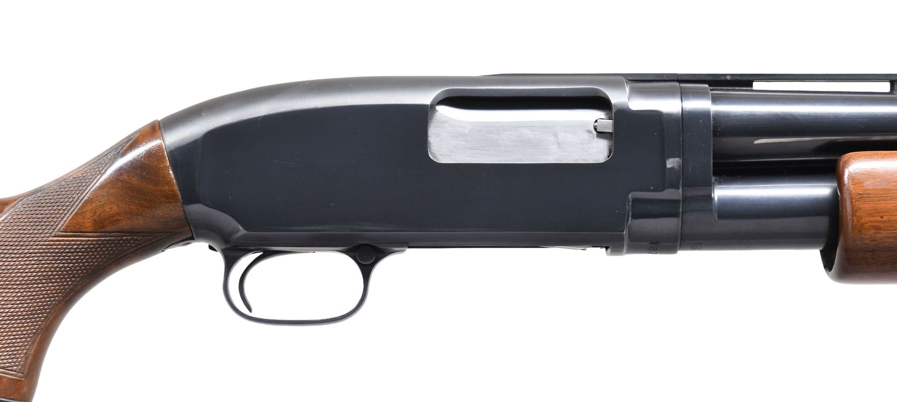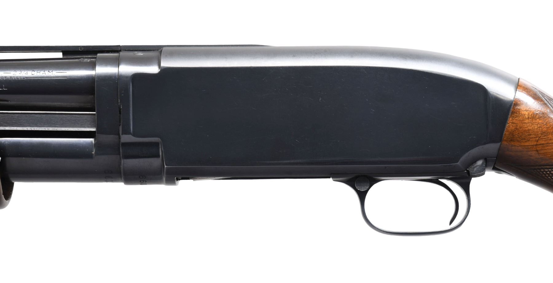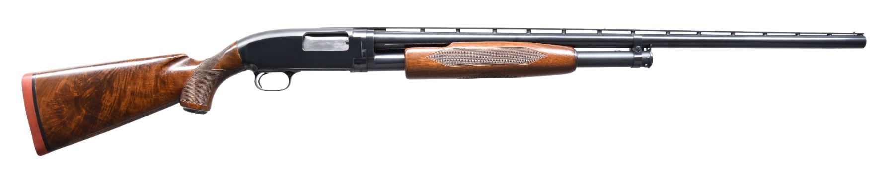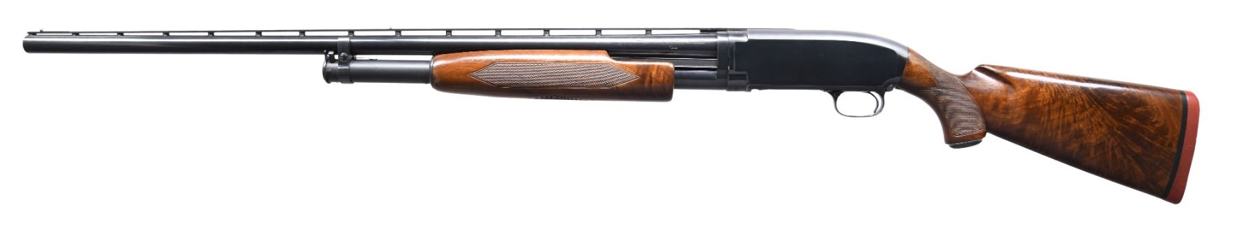 SHOTGUN. Cal. 12 ga. 2 3/4". S#. 1870099. Bbl. 30" w/ factory large round post Special vent rib & steel beads. Fixed Full choke. Beavertail forend & trap dimension straight comb stock of fancy walnut. Features include steel grip cap, target pattern checkering & original solid red pad. LOP. is 13 1/2". Mfg. 1961. CONDITION: 95% original blue showing slide wear. Wood finish shows scattered light scratches. Sound action. Very good bright bore. (24-6291/DS). CURIO. $800-1200.