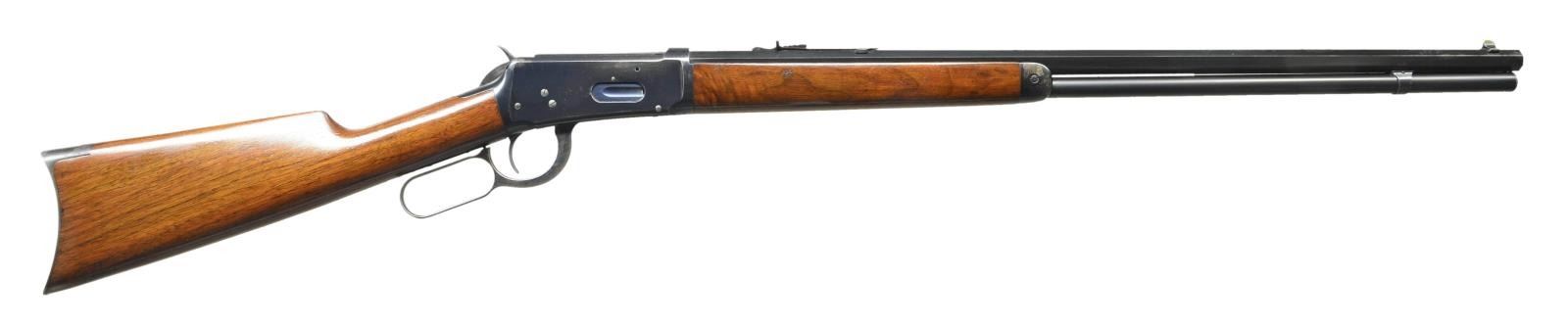 Cal. 30 WCF (30-30). S# 404193. Bbl. 26" Octagon. Full length tubular mag. Sporting front sight with flat top elevator adjustable rear. Blued finish w/ case colored hammer, lever & crescent steel buttplate. Walnut forearm & straight grip stock. Polishing room records indicate 1908 mfg. CONDITION: very high condition all original rifle. Over 90% bright blue showing light carry wear w/ scattered spots of darkening having light pitting on bbl. & action. Hammer & lever retain over 90% case colors showing sm. dark spots. Buttplate colors are fading & show spots of darkening. Very good original wood finish showing scattered scratches, sm. dents & marks. Bright bore with sharp rifling. (22-5247/DS). CURIO. $4,000-5,500.
