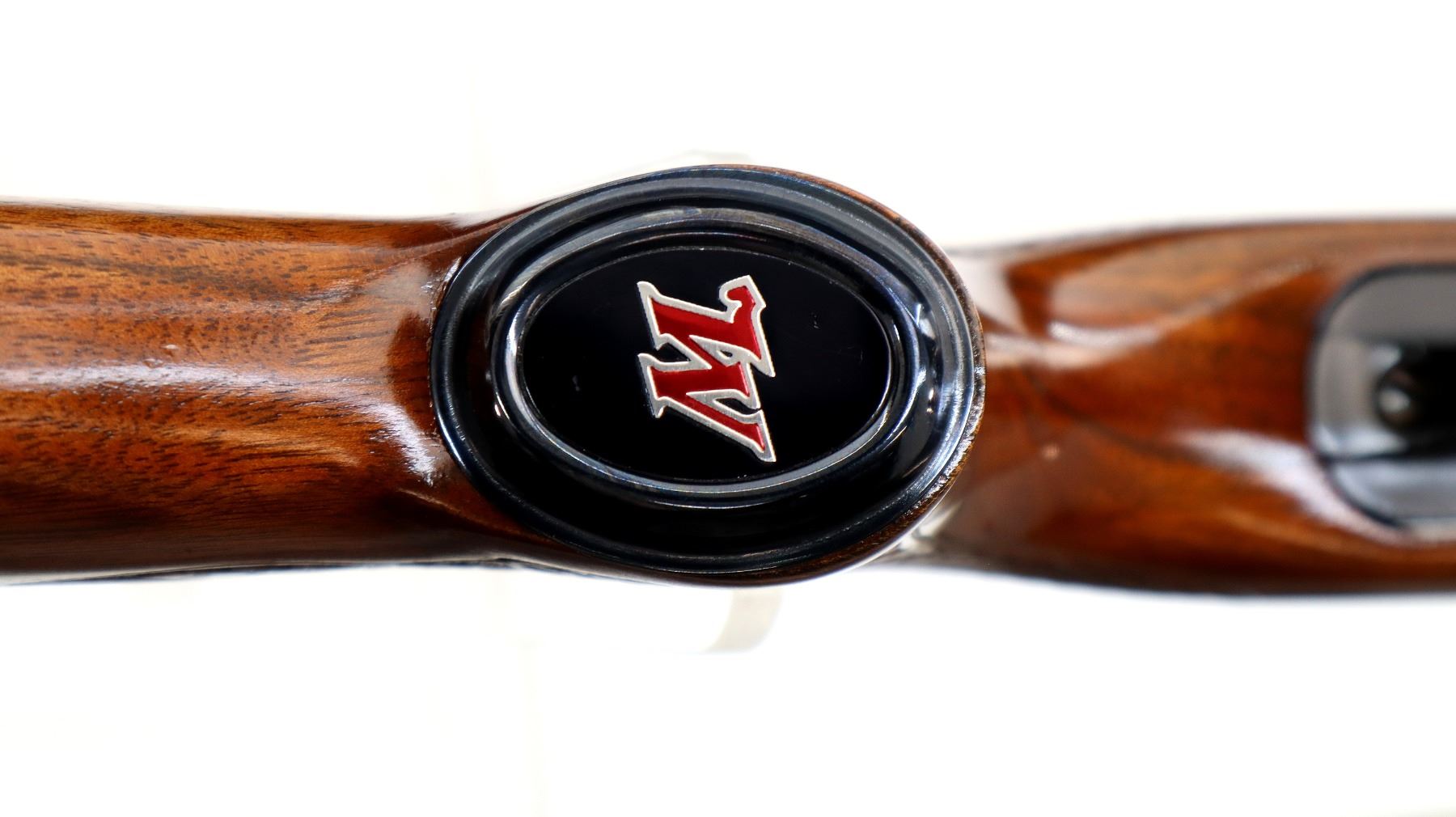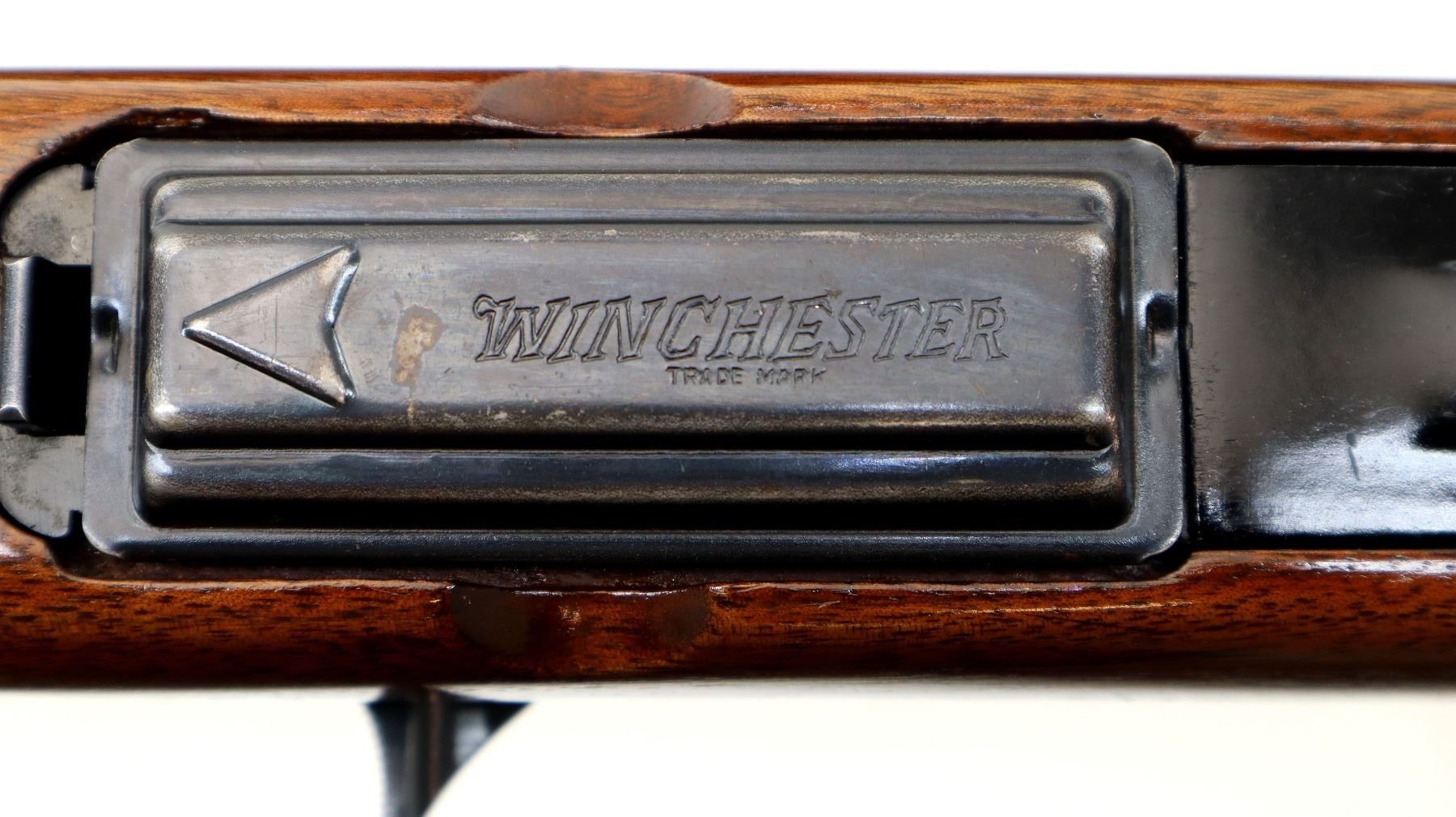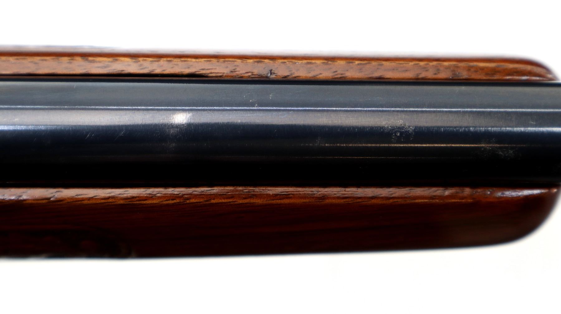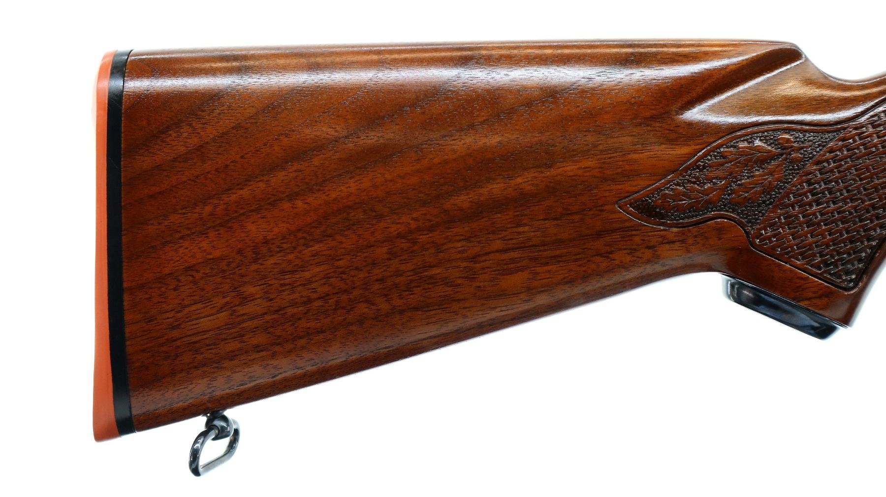 Main Description: Manufactured 1966. Blade front sight with hood and ramp, adjustable folding u notched rear sight, blued finish, receiver drilled and tapped with two piece bases and 1" Weaver rings installed. One piece refinished wood stock, Basketweave checkered forearm and pistol grip with oak leaves, red rubber recoil pad, 13" LOP, steel grip cap, sling swivels.