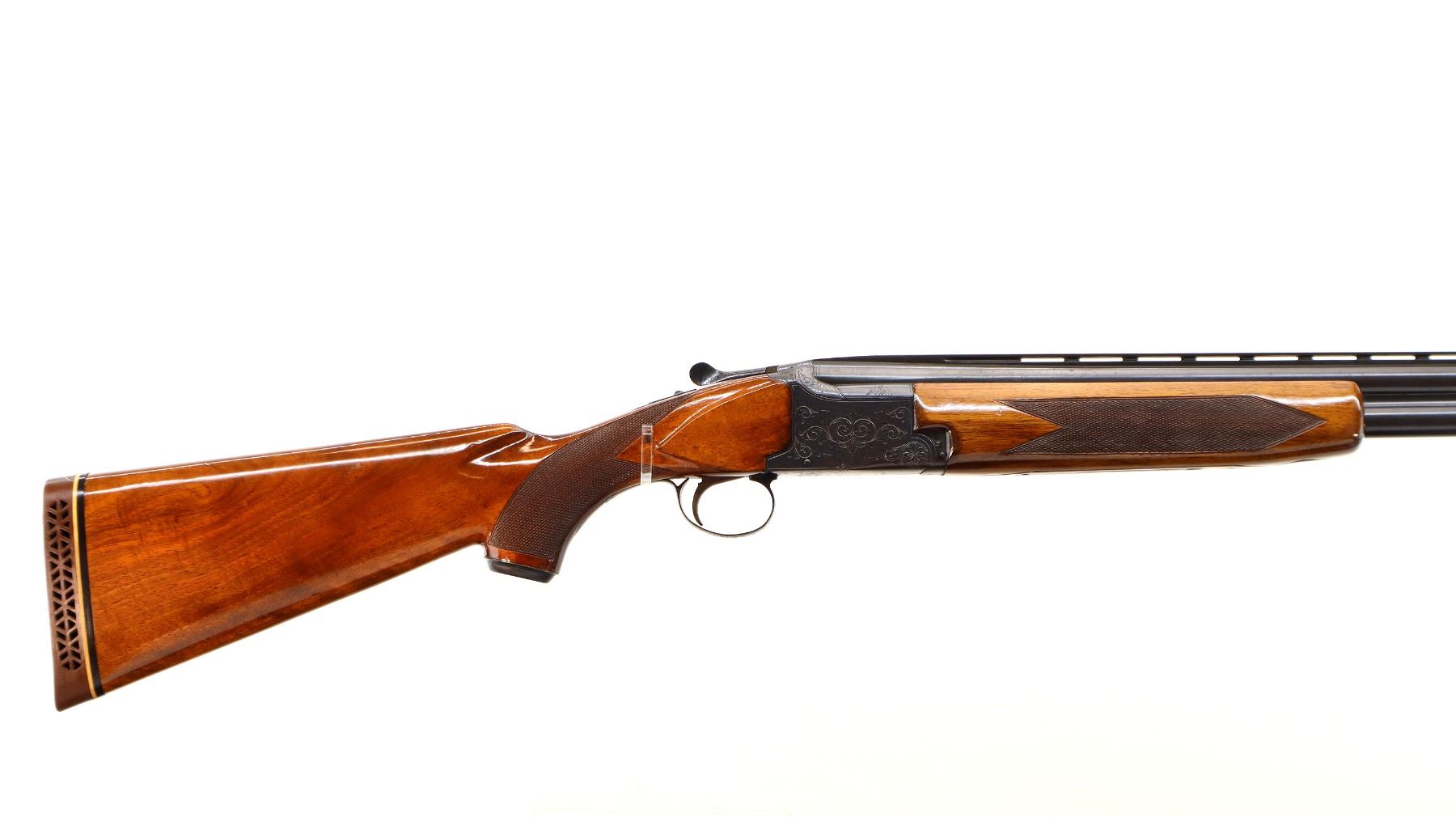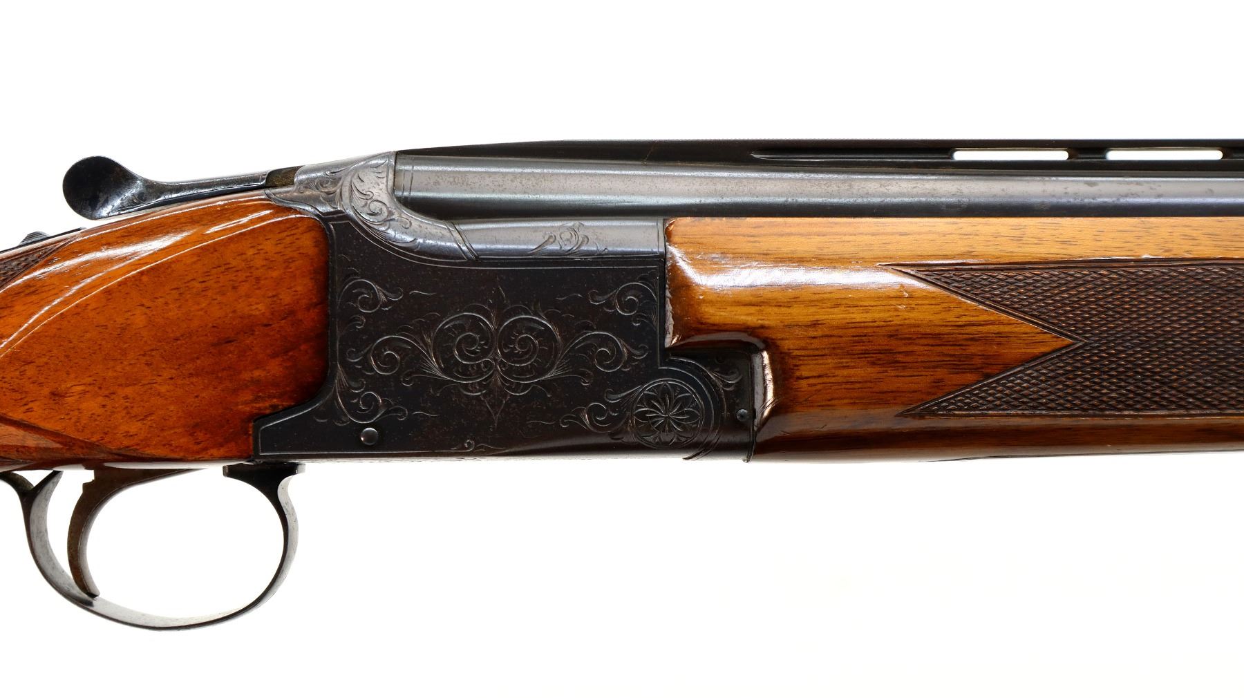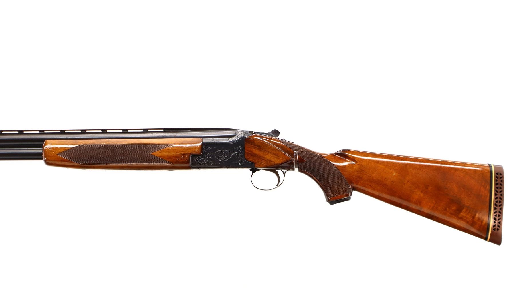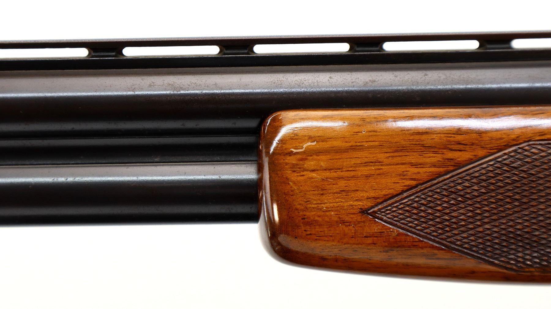 Main Description: Silver bead, blued finish, vent rib, engraved receiver, manual selective safety, ejectors, single mechanical trigger. Two piece wood stocks, checkered forearm and pistol grip, brown vented rubber recoil pad, steel grip cap, missing center insert.