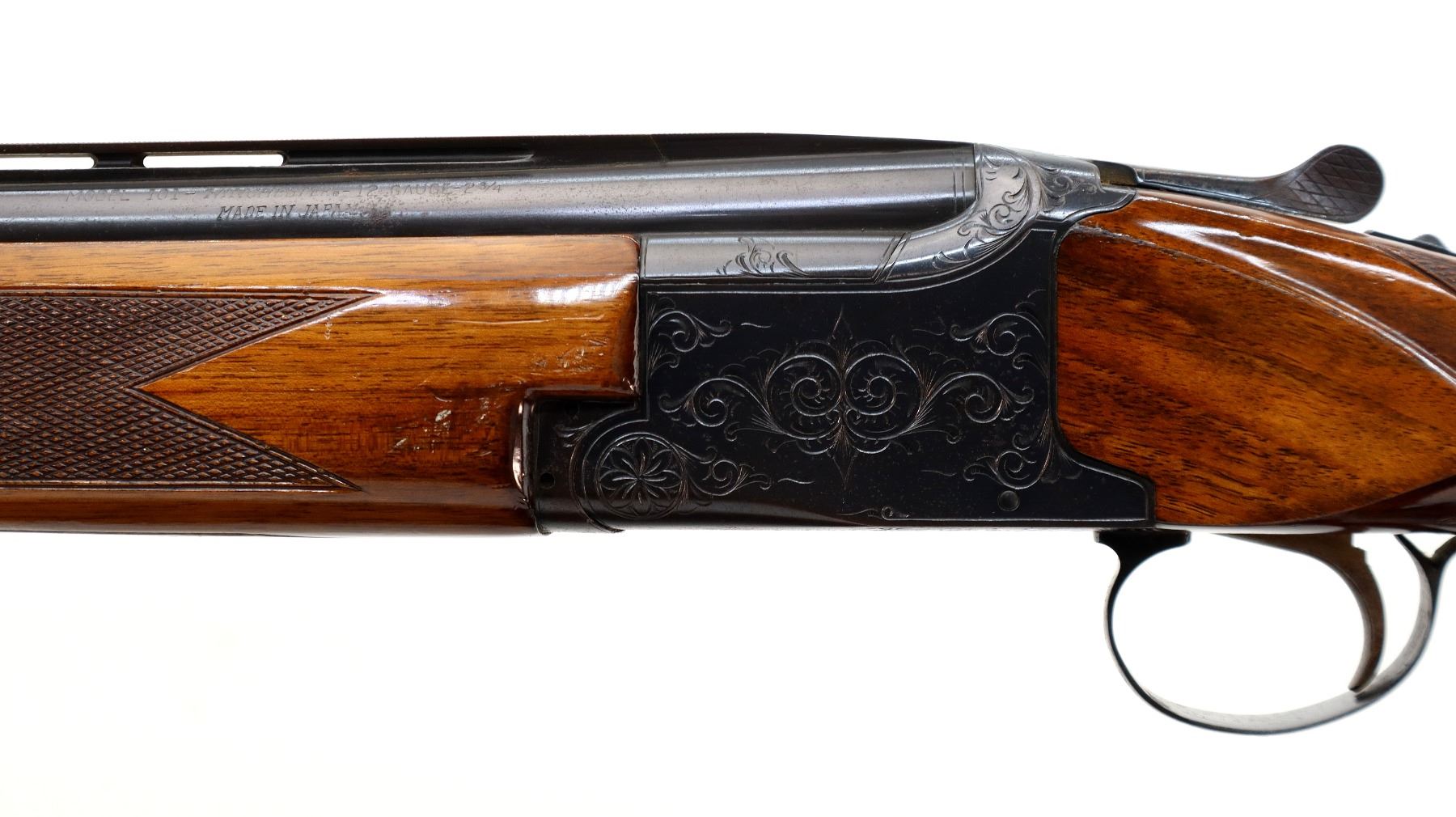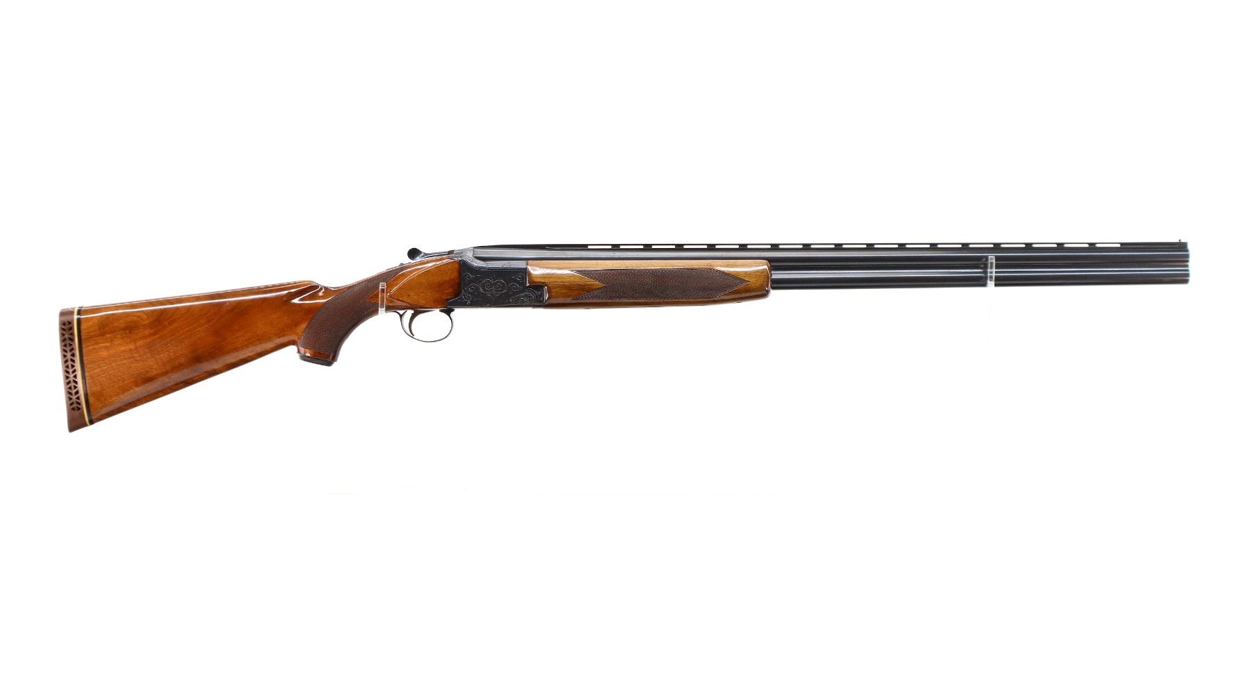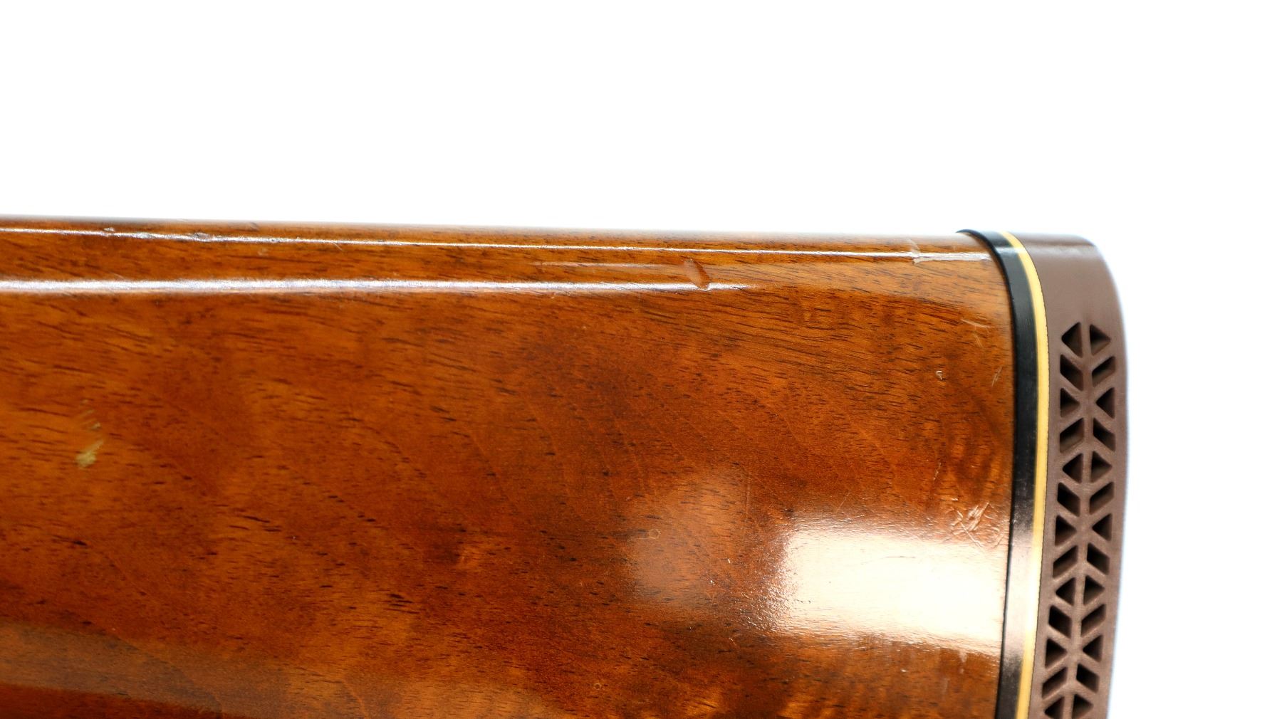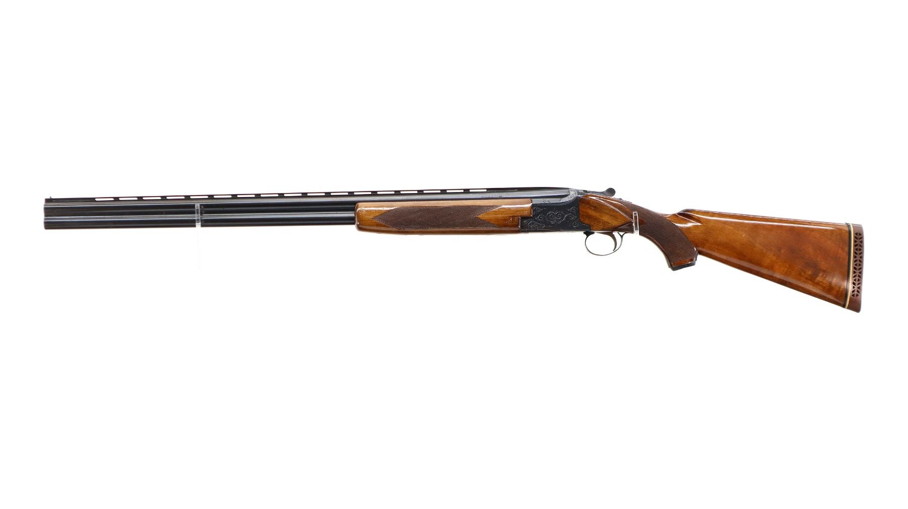 Main Description: Silver bead, blued finish, vent rib, engraved receiver, manual selective safety, ejectors, single mechanical trigger. Two piece wood stocks, checkered forearm and pistol grip, brown vented rubber recoil pad, steel grip cap, missing center insert.