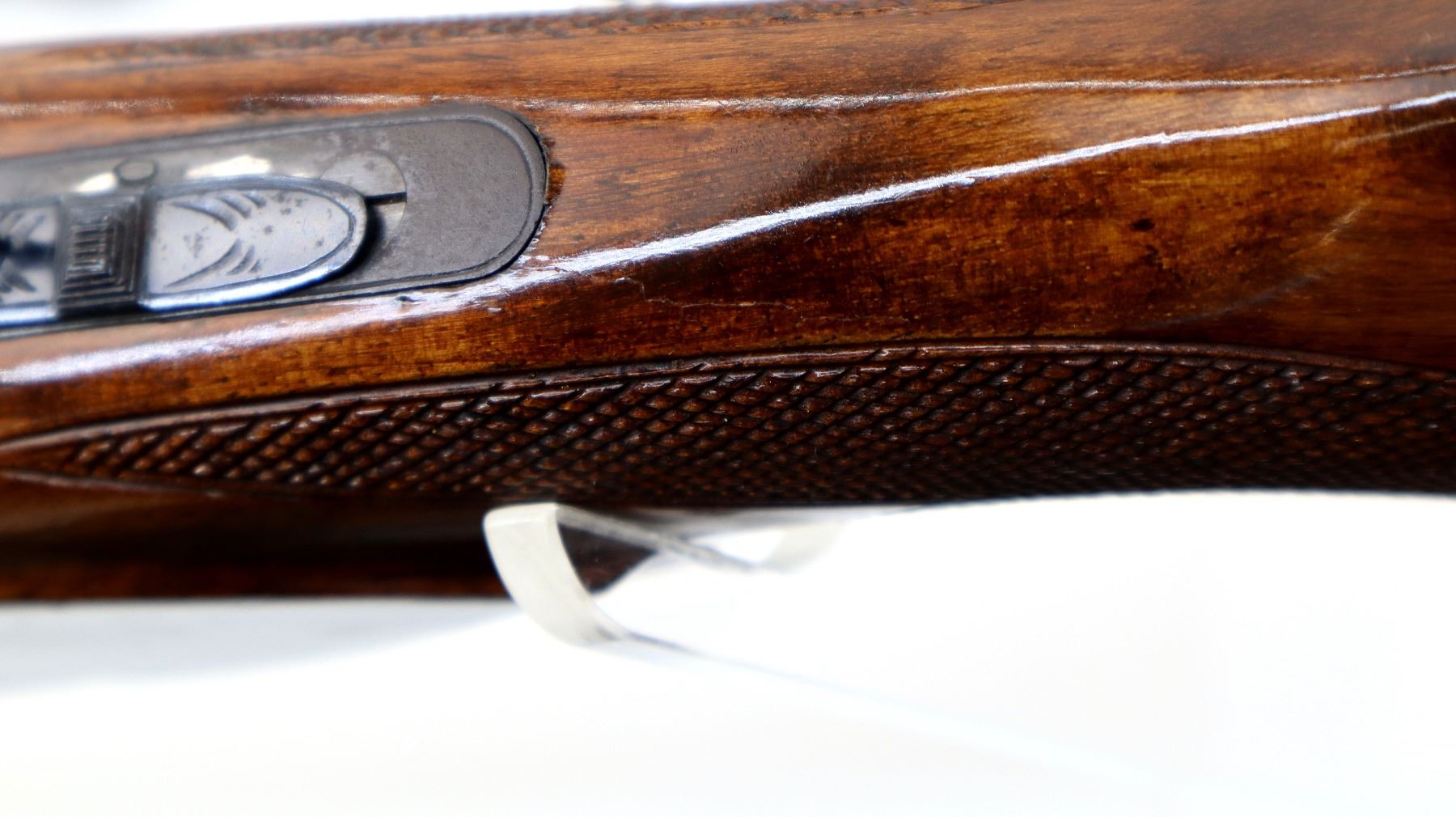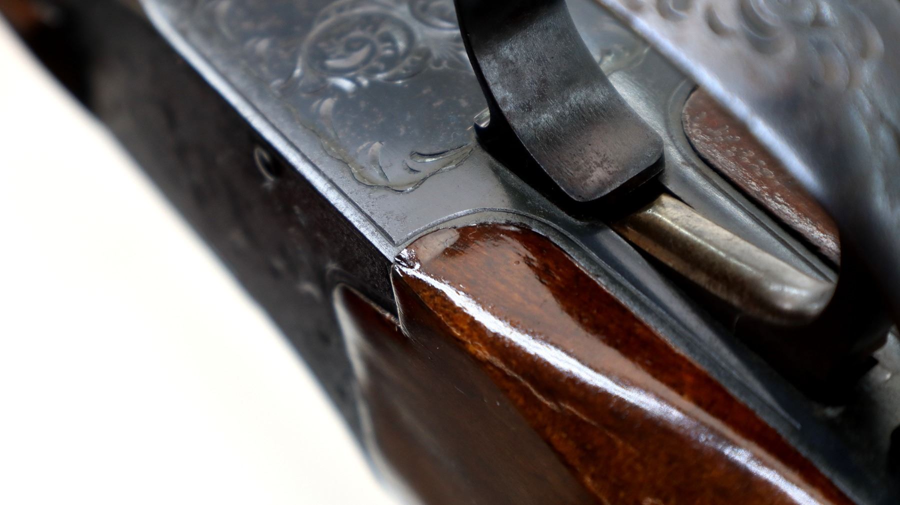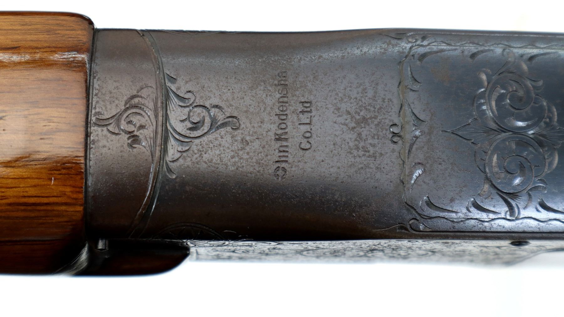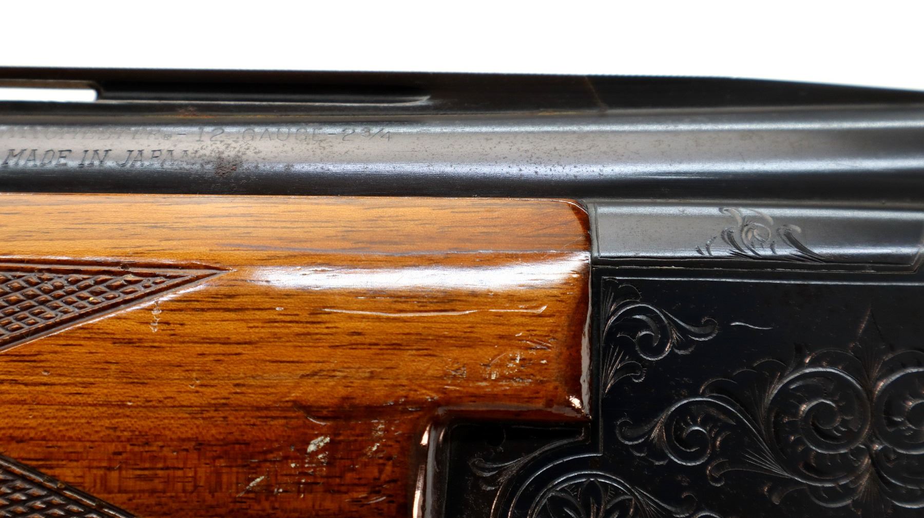 Main Description: Silver bead, blued finish, vent rib, engraved receiver, manual selective safety, ejectors, single mechanical trigger. Two piece wood stocks, checkered forearm and pistol grip, brown vented rubber recoil pad, steel grip cap, missing center insert.